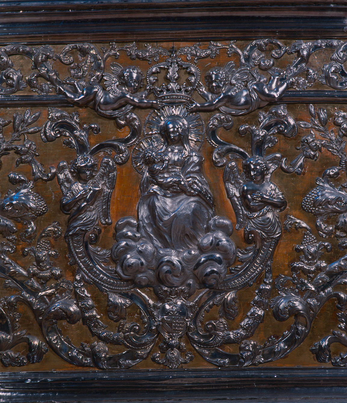 Paliotto il lamina d'argento sbalzata e cesellata fissata con chiodi su supporto ligneo dorato. Al centro è la figura a sbalzo della Madonna col Bambino, incoronata da due angeli in volo e quasi racchiusa da volute vegetali su cui sono due angeli a mezzo busto a guisa di cariatidi; al di sotto è l'emblema araldico del committente; ai lati un fitto gioco di volute, foglie d'acanto, melograni e angeli in volo che reggono ora gigli, ora pendoni di melograni, ora rami d'alloro. Intorno, su tre lati, corre un bordo con analoghi motivi
