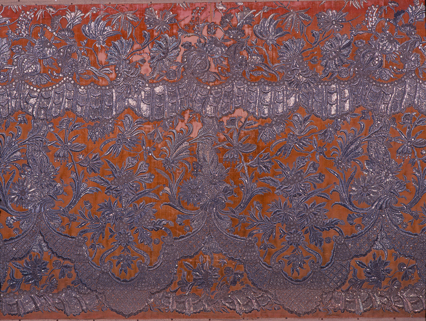 Parato composto della veste e del mantello della Vergine e dall'abitino di Gesù. Velluto riccio unito a fondo raso. Seta rosa salmone. Ricamo eseguito a punto passato in argento filato, a punto steso in lamina d'argento, completato da applicazioni di canuttiglia, piallettes, borchiette ecc. argento. Il disegno, ricchissimo, si connota per festoni a larghi smerli e a embricature cui si intreccia una sovrabbondante flora esotica composta di tralci , foglie, frutti, fiori di specie rare e d'invenzione. Argento su rosa salmone. Lungo i bordi è cucito in gallone lavorato a fuselli in argento filato, riccio e in lamina. Fodere in taffetas avorio