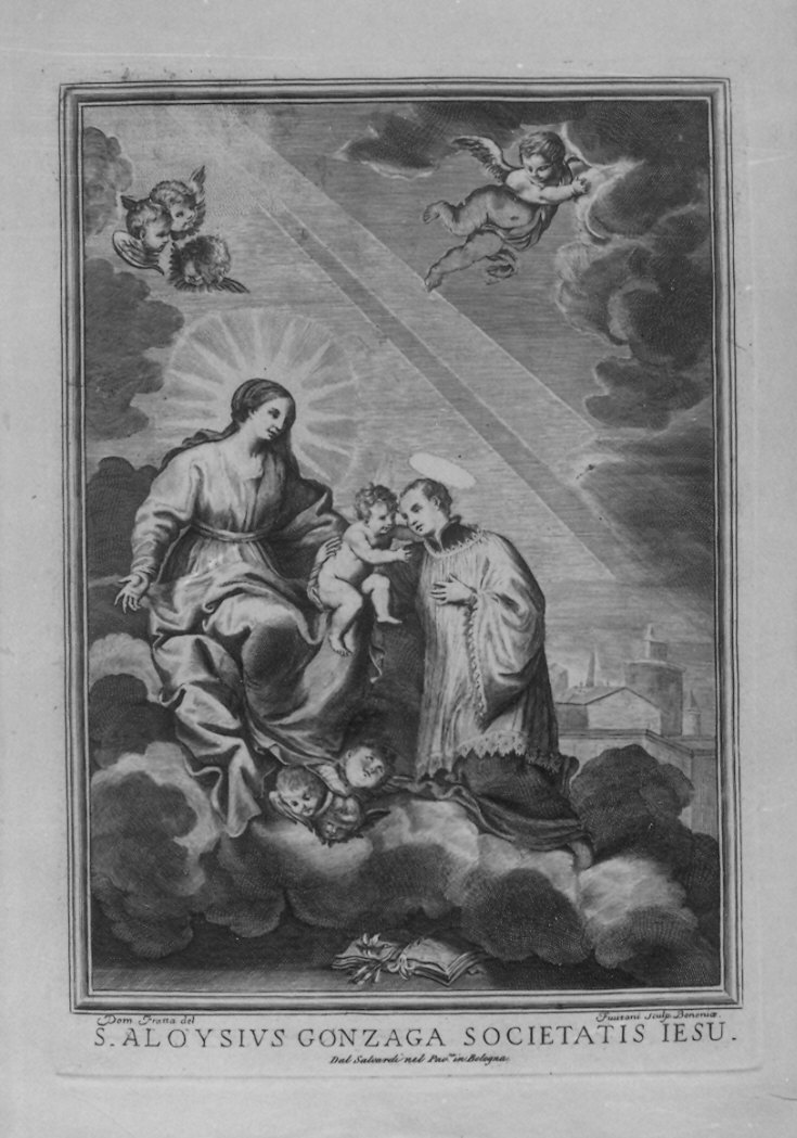 Personaggi: Madonna con Bambino; San Luigi Gonzaga. Figure: angeli; cherubini. Elementi architettonici. Attributi: (San Luigi Gonzaga) giglio; libro. Fenomeni divini: raggi di luce