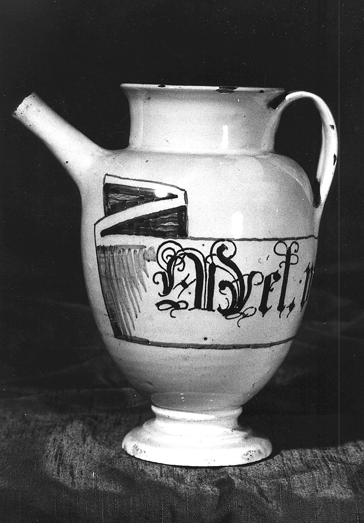 Il vaso mostra corpo ovoidale, poggiante su piede slanciato, svasato e con stretto colletto a modanature; è dotato inoltre di lungo cannello cilindrico e di manico a nastro; la bocca è ampia e a parete cilindrica. Sulla zona mediana, orizzontalmente sotto il manico, si dispone una nastro con estremità a ripiegature rigide su cui è tracciata a carattere gotico l'iscrizione farmaceutica. Dipinto in blu il nastro e in bruno di manganese l'iscrizione