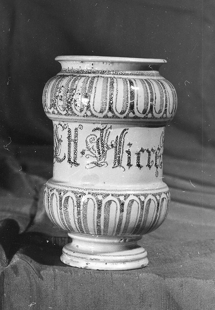 - NOTIZIE STORICO CRITICHE La scritta si riferisce all'Elettuario di Hiera Pichra di Galeno. Il vaso appartiene al gruppo numericamente più cospicuo del corredo ceramico della Spezieria, caratterizzato dal diffuso decoro barocco a doppia baccellatura, che in queste forme si afferma nella maiolica tra Sei e Settecento. Problematica l'individuazione dell'ambito di provenienza, presentando caratteri comuni al vasellame di farmacia di molte officine dell'Italia settentrionale