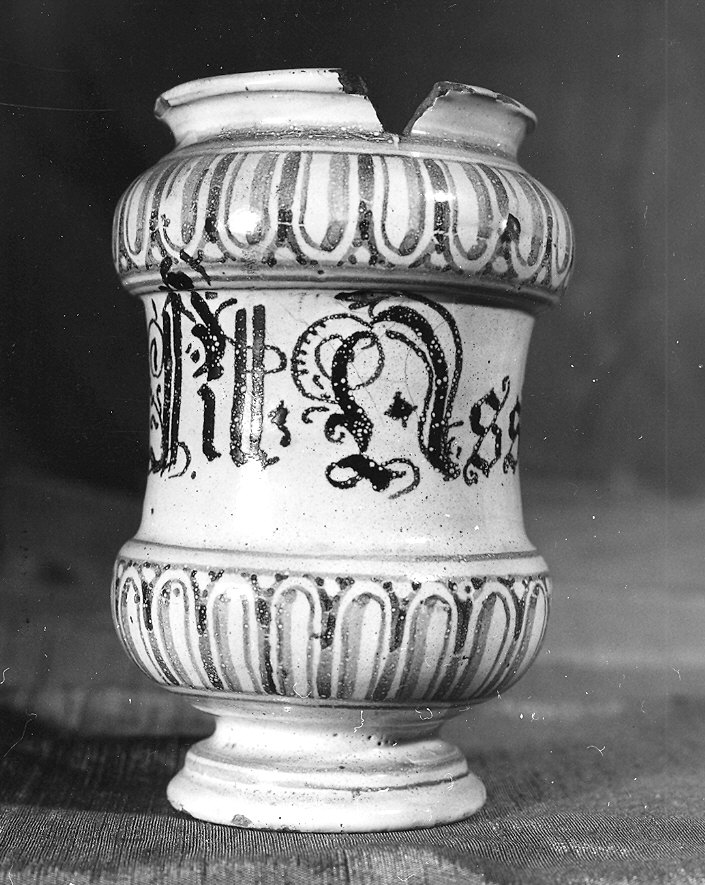 - NOTIZIE STORICO CRITICHE La scritta si riferisce alle Pillole Assariet. Il vaso appartiene al gruppo numericamente più cospicuo del corredo ceramico della Spezieria, caratterizzato dal diffuso decoro barocco a doppia baccellatura, che in queste forme si afferma nella maiolica tra Sei e Settecento. Problematica l'individuazione dell'ambito di provenienza, presentando caratteri comuni al vasellame di farmacia di molte officine dell'Italia settentrionale
