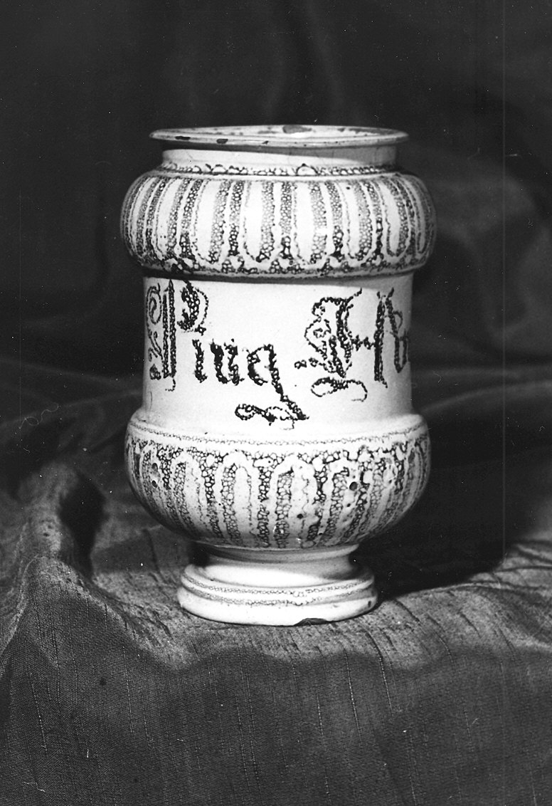 - NOTIZIE STORICO CRITICHE La scritta si riferisce alla Pinguedine umana. Il vaso appartiene al gruppo numericamente più cospicuo del corredo ceramico della Spezieria, caratterizzato dal diffuso decoro barocco a doppia baccellatura, che in queste forme si afferma nella maiolica tra Sei e Settecento. Problematica l'individuazione dell'ambito di provenienza, presentando caratteri comuni al vasellame di farmacia di molte officine dell'Italia settentrionale