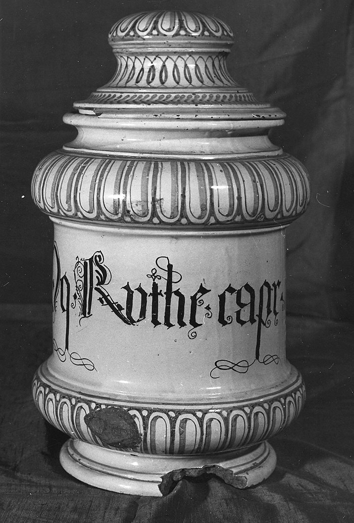 - NOTIZIE STORICO CRITICHE Il grande alberello appartiene al gruppo di vasi numericamente più cospicuo del corredo ceramico della Spezieria, caratterizzato dal diffuso decoro barocco a doppia baccellatura, che in questa forma si afferma nella maiolica tra Sei e Settecento. Problematica l'individuazione dell'ambito di provenienza, presentando i pezzi caratteri comuni al vasellame di farmacia di molte officine dell'Italia settentrionale. La scritta si riferisce all' "Acqua di ruta capraria", cui gli antichi antidotari riconoscevano proprietà contro l'epilessia, le febbri maligne, la correa di San Vito e il morso dei serpenti velenosi