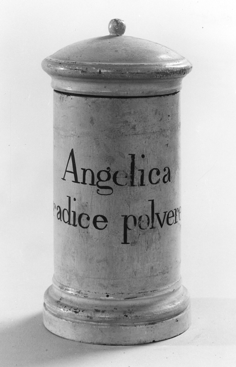 - NOTIZIE STORICO CRITICHE Il barattolo appartiene ad un cospicuo gruppo di vasi, cronologicamente tra i più tardi del corredo della Spezieria, ascrivibile al XIX secolo (forse anteriore al 1857, data del quadro di Luigi Marchesi, presso la Galleria Nazionale di Parma, che ritrae la Farmacia di San Giovanni mostrando barattoli simili per tipologia a quelli in esame). Difficile individuare l'officina di provenienza, essendo questo tipo di oggetto largamente prodotto sia in ambito italiano che europeo: nel caso specifico si può ipotizzare una manifattura locale attiva tra '700 e '800, impegnata in generi minori di largo uso. La scritta si riferisce alla polvere di radice di "Angelica Archangelica", dalle proprietà aromatizzanti, eupeptiche, carminative