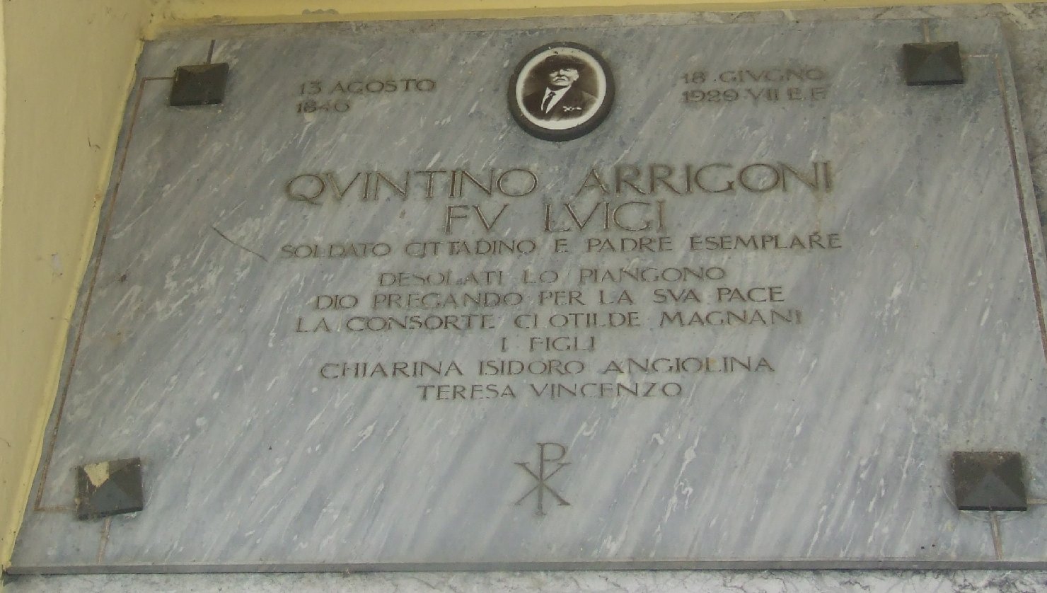 Lapide commemorativa di forma rettangolare in marmo bianco bardiglio corredata di fotoceramica recante inciso a impasto color rosso il nome del caduto Quintino Arrigoni e la dedica dei famigliari