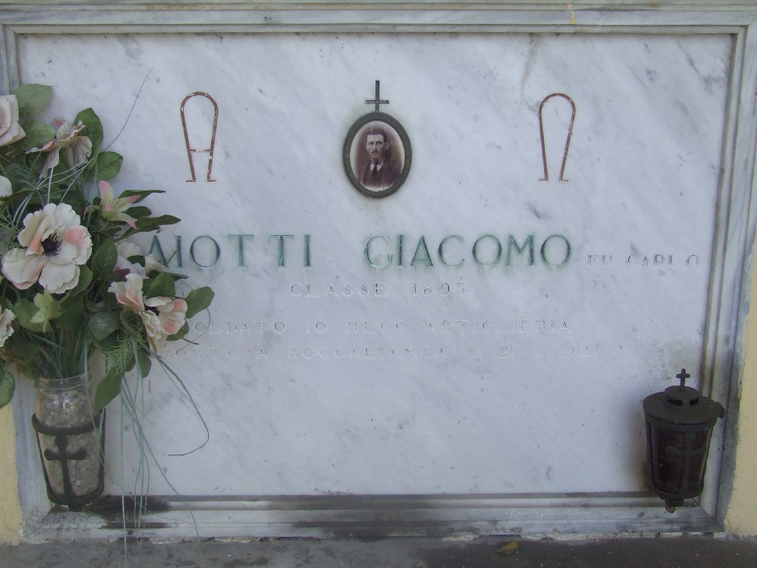 - ISCRIZIONI a tutto campo - [...]AIOTTI GIACOMO FU CARLO/ CLASSE 1895/ SOLDATO 10 REGG. ARTIGLIERIA/ MORTO A ROCCABIANCA IL 21 - 8 - 1921 - lettere capitali - a incisione -