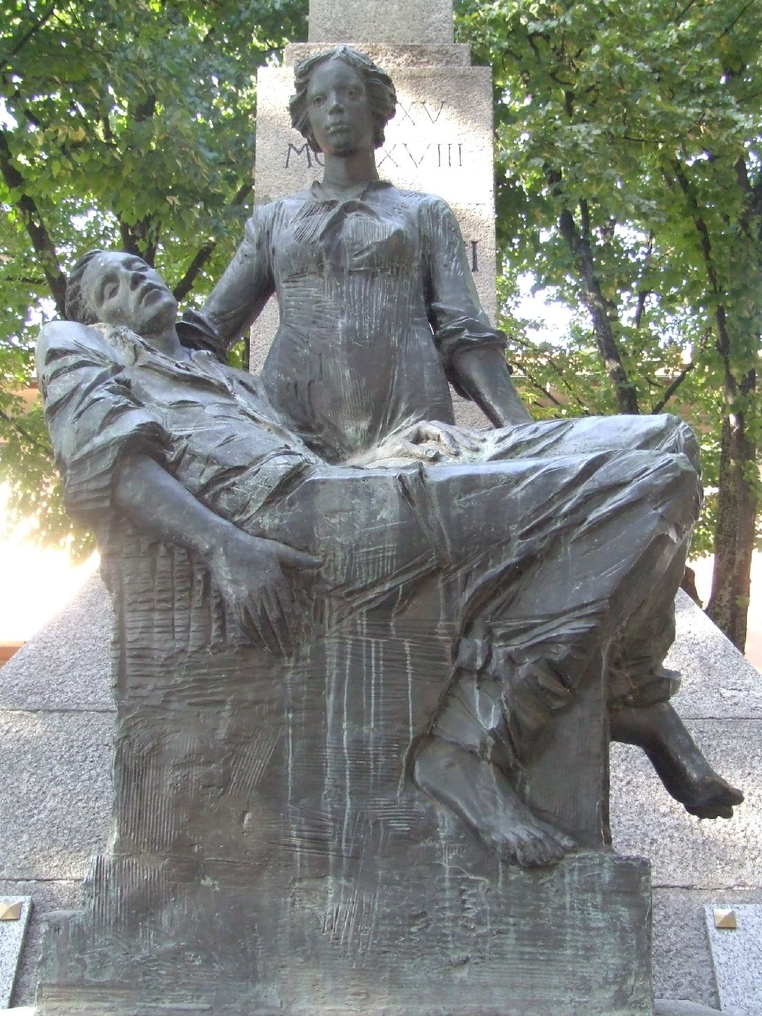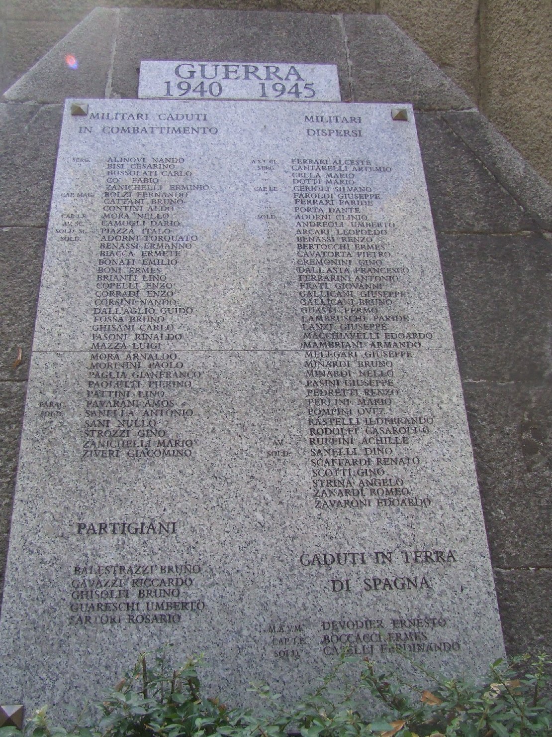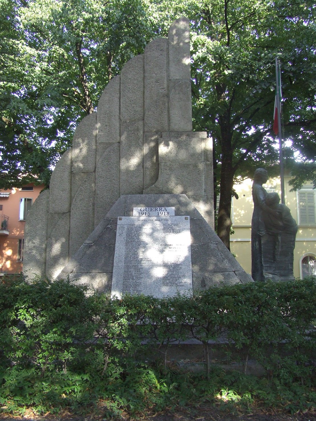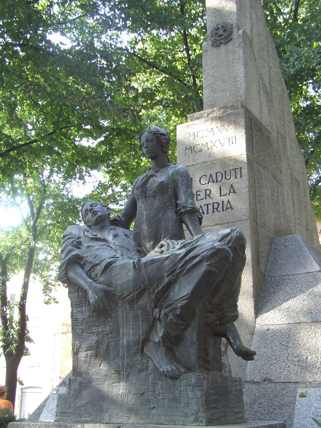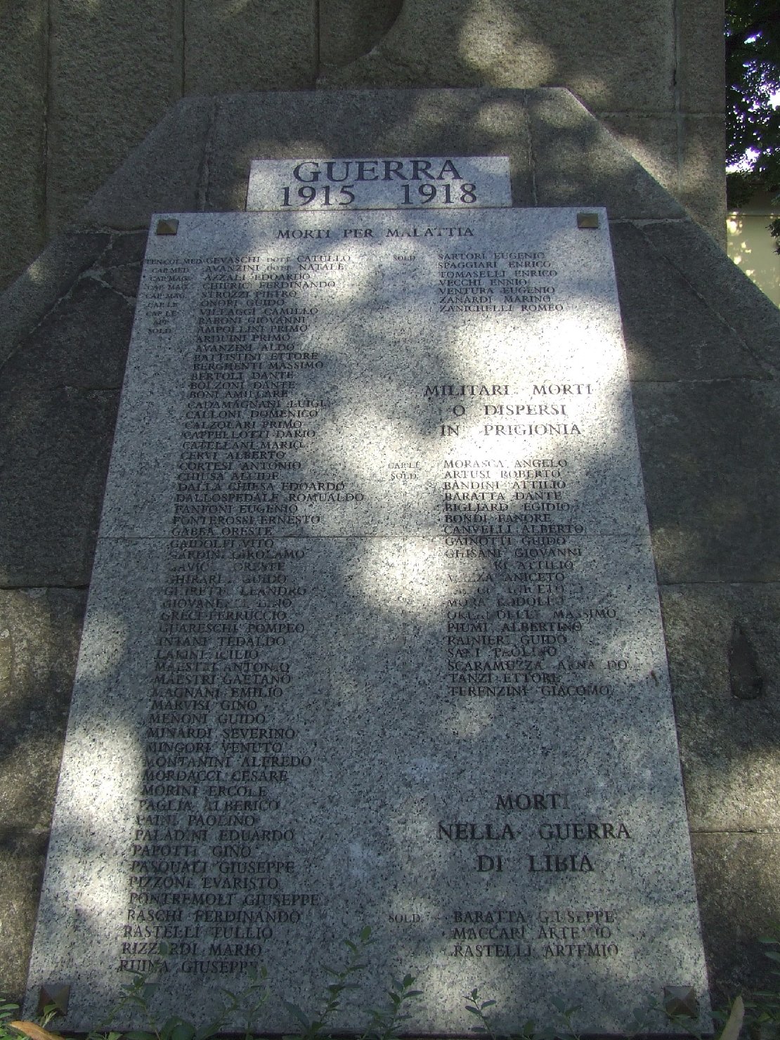 Monumento commemorativo ai caduti di entrambi i conflitti mondiali costituito: da una basamento in pietra granitica sormontato da una scultura in pietra