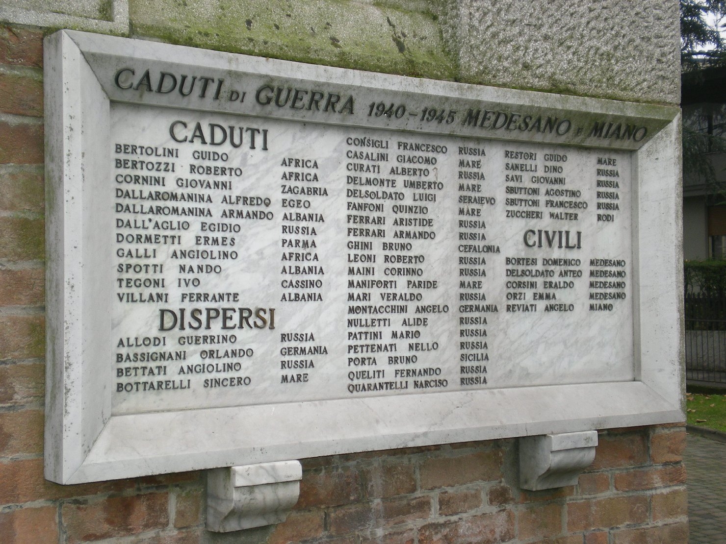 - ISCRIZIONI al centro, a tutto campo - CADUTI DI GUERRA 1940-1945 MEDESANO E MIANO/ CADUTI/ BERTOLINI GUIDO AFRICA/ BERTOZZI ROBERTO AFRICA/ CORNINI GIOVANNI ZAGABRIA/ DALLAROMANINA ALFREDO EGEO/ DALLAROMANINA ARMANDO ALBANIA/ DALL'AGLIO EGIDIO RUSSIA/ DORMETTI ERMES PARMA/ GALLI ANGIOLINO AFRICA/ SPOTTI NANDO ALBANIA/ TEGONI IVO CASSINO/ VILLANI FERRANTE ALBANIA/ DISPERSI/ ALLODI GUERRINO RUSSIA/ BASSIGNANI ORLANDO GERMANIA/ BETTATI ANGIOLINO RUSSIA/ BOTTARELLI SINCERO MARE/ CONSIGLI FRANCESCO RUSSIA/ CASALINI GIACOMO MARE/ CURATI ALBERTO RUSSIA/ DELMONTE UMBERTO MARE/ DELSOLDATO LUIGI SERAIEVO/ FANFONI QUINZIO MARE/ FERRARI ARISTIDE RUSSIA/ FERRARI ARMANDO RUSSIA/ GHINI BRUNO CEFALONIA/ LEONI ROBERTO RUSSIA/ MAINI CORINNO RUSSIA/ MANIFORTI PARIDE MARE/ MARI VERALDO RUSSIA/ MONTACCHINI ANGELO GERMANIA/ NULLETTI ALIDE RUSSIA/ PATTINI MARIO RUSSIA/ PETTENATI NELLO RUSSIA/ PORTA BRUNO SICILIA/ QUELITI FERNANDO RUSSIA/ QUARANTELLI NARCISO RUSSIA/ RESTORI GUIDO MARE/ SANELLI DINO RUSSIA/ SAVI GIOVANNI RUSSIA/ SBUTTONI AGOSTINO RUSSIA/ SBUTTONI FRANCESCO RUSSIA/ ZUCCHERI WALTER RODI/ CIVILI/ BORTESI DOMENICO MEDESANO/ DELSOLDATO ANTEO MEDESANO/ CORSINI ERALDO MEDESSANO/ ORZI EMMA MEDESANO/ REVIATI ANGELO MIANO - lettere capitali - a caratteri applicati -