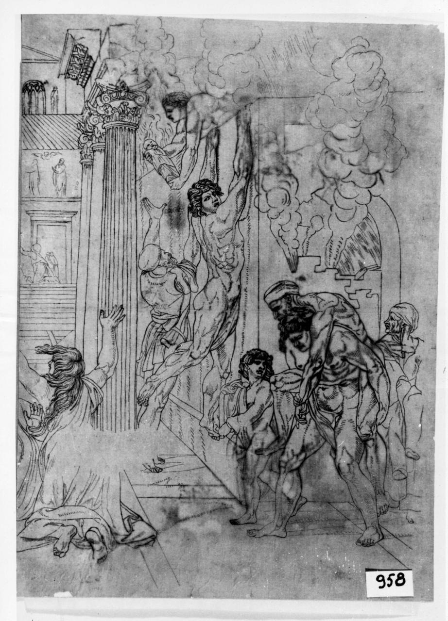 - NOTIZIE STORICO CRITICHE Il disegno, che può essere identificato con quello assegnato da Castellani Tarabini a Giulio Romano (1854, n°8), riproduce, in controparte la zona sinistra dell'affresco con l"'Incendio di Borgo", eseguito da Raffaello nell'omonima Stanza in Vaticano nel 1514. La copia, eseguita semplicemente a penna, ha probabilmente una finalità incisoria (come riporta l'iscrizione sul montaggio) e piuttosto che opera di Giulio Romano, attribuzione non sostenibile, si tratta invece di opera anche piuttosto tarda nell'esecuzione