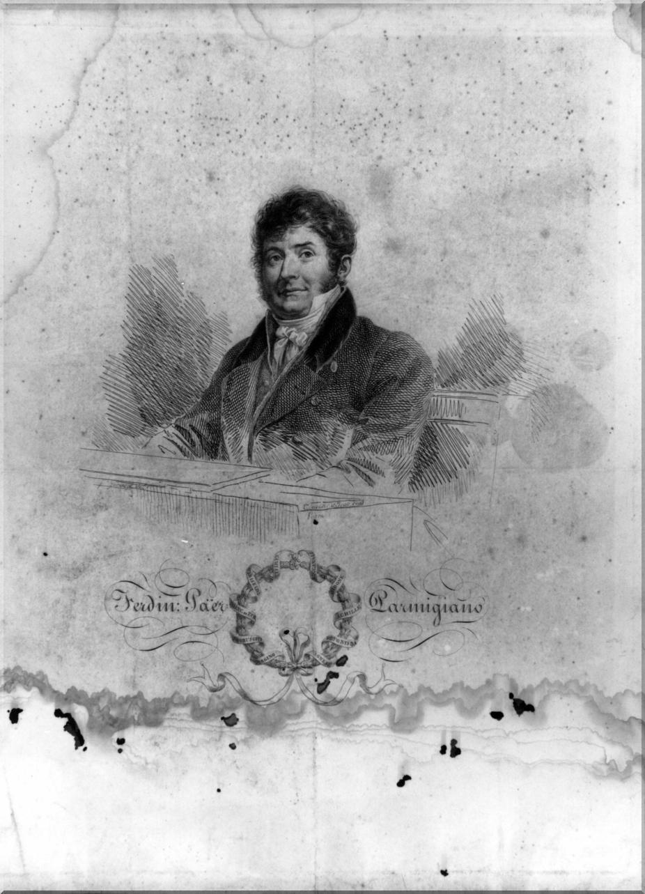 - NOTIZIE STORICO CRITICHE La stampa si deve alla collaborazione tra Paolo Toschi e il cognato e soci o Antonio Isac.Quest'ultimo aveva fondato fin dal 1814 una scuola di inci s ione che prenderà in seguito il nome di studio Isac-Toschi. L'opera è t ra tta dal disegno di François Gérard conservato al museo Glauco Lombardi di Parma. Il Paer (1771-1839) fu un famoso musicista e compositore parmigi ano . Fu attivo presso la corte ducale di Ferdinando di Borbone e in segui to i n diverse capitali europee, come maestro di cappella. A Parigi , dove si trasferirà nel 1807, Paer sarà maestro di musica di Maria Luigia d'Asb urgo -Lorena, seconda moglie di Napoleone e futura duchessa di Parma e di Piace nza. La Medioli Masotti (1973, p.75) afferma che il rame fu eseguito nel 1 825. La notizia trova conferma dalla lettura del carteggio Toschi ( cfr. Ma villa 1992). Alla data in esame si trovano infatti diverse lettere inviate ad amici, negozianti di stampe, editori e calcografi nelle qualli la stam pa viene citata come già eseguita e pronta per essere piazzata su l mercato dei possibili acquirenti