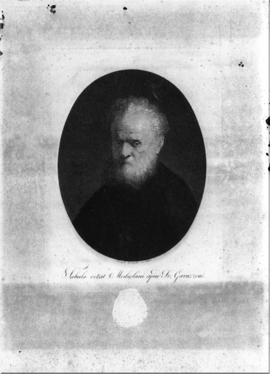 - NOTIZIE STORICO CRITICHE Eseguita ad acquaforte e bulino a genere libero la stampa riproduce il "Ri tratto di vecchio con barba", detto "il Bianco" del Museo di Lipsia. Il d ipinto, eseguito da Rembrandt intorno al 1639, si trovava all'epoca di L on ghi nella collezione milanese di F. Gavazzeni, come ricorda anche l'isc riz ione e ribadisce il Longhena. Tra i biografi di Longhi, il Beretta (18 37, p. 28) coglie per primo una serie di notazioni tecniche, come "il curi oso scherzo di luce" che traspare dal volto solcato di rughe dove "i lumi sono disposti a squadrature, a tondi, a triangoli irregolari da presentarn e in dubbiamente all'occhio la vera inegual cute di vaioloso". Il risulta to è un realismo quasi mimetico dove sono proprio "le intralciature dei ta gli ( ...) così svariate e mosse" a suggerire l'effetto della vecchiaia e dei su oi accidenti fisici. La stampa, datata 1800, risale agli anni dell a prima attività di Longhi e testimonia l'intenso studio degli esempi e de i modi rembrandtiani