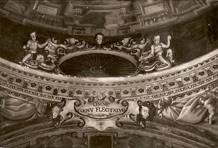 Decorazione a stucco bianco e dorato dei quattro finetrini. Attorno ai quattro finetrini ovali, una cornice a ricche volute, sormontata da una testa di cherubino, e, esternamente, due angioletti reggenti una cortina