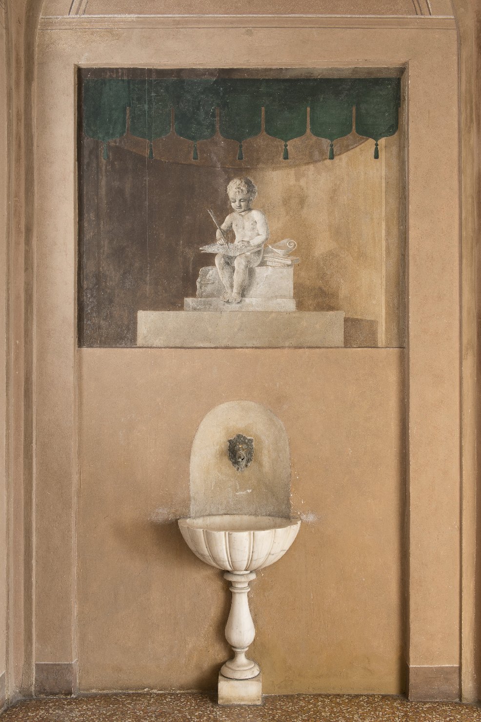 Figura di bambino seduto su un plinto di marmo, in atto di scrivere, con accanto alcuni libri. E' condotta a monocromo e inquadrata in una esedra dipinta chiusa in alto da una mantovana verde scuro con nappe. E' collocato sopra alla fontanella