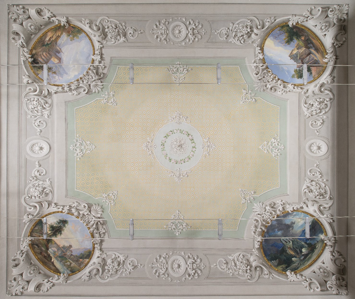 Ampio riquadro centrale in colori pastello. Agli angoli ovali con paesaggi di genere racchiusi da una filettatura dorata e compresi entro una più ampia cornice a volute dipinte in monocromo grigio