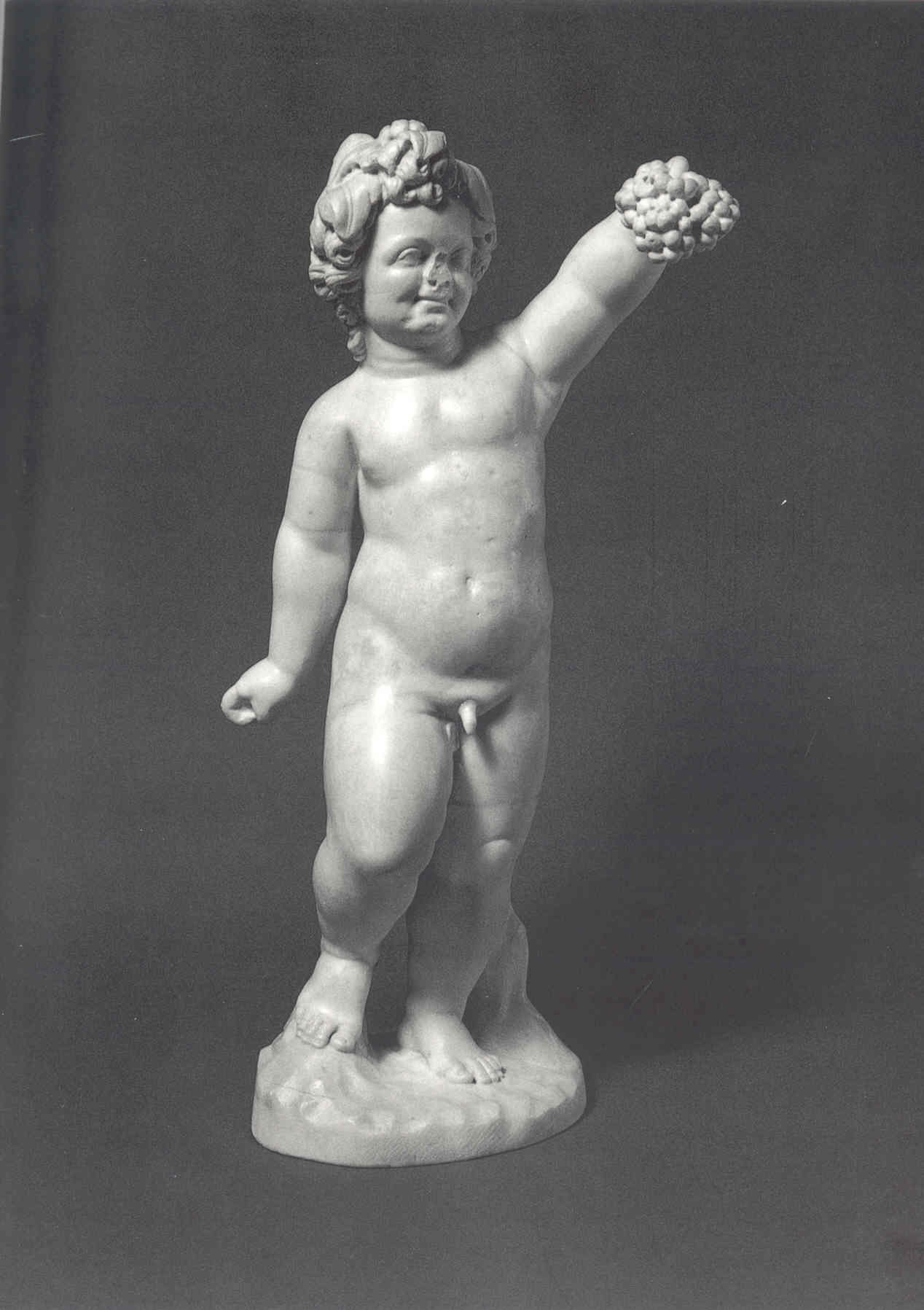 Figura di putto in piedi, con folti capelli mossi su cui poggia una corona di foglie d'uva, in atto di tenere nella mano sinistra, sollevata, un grappolo d'uva