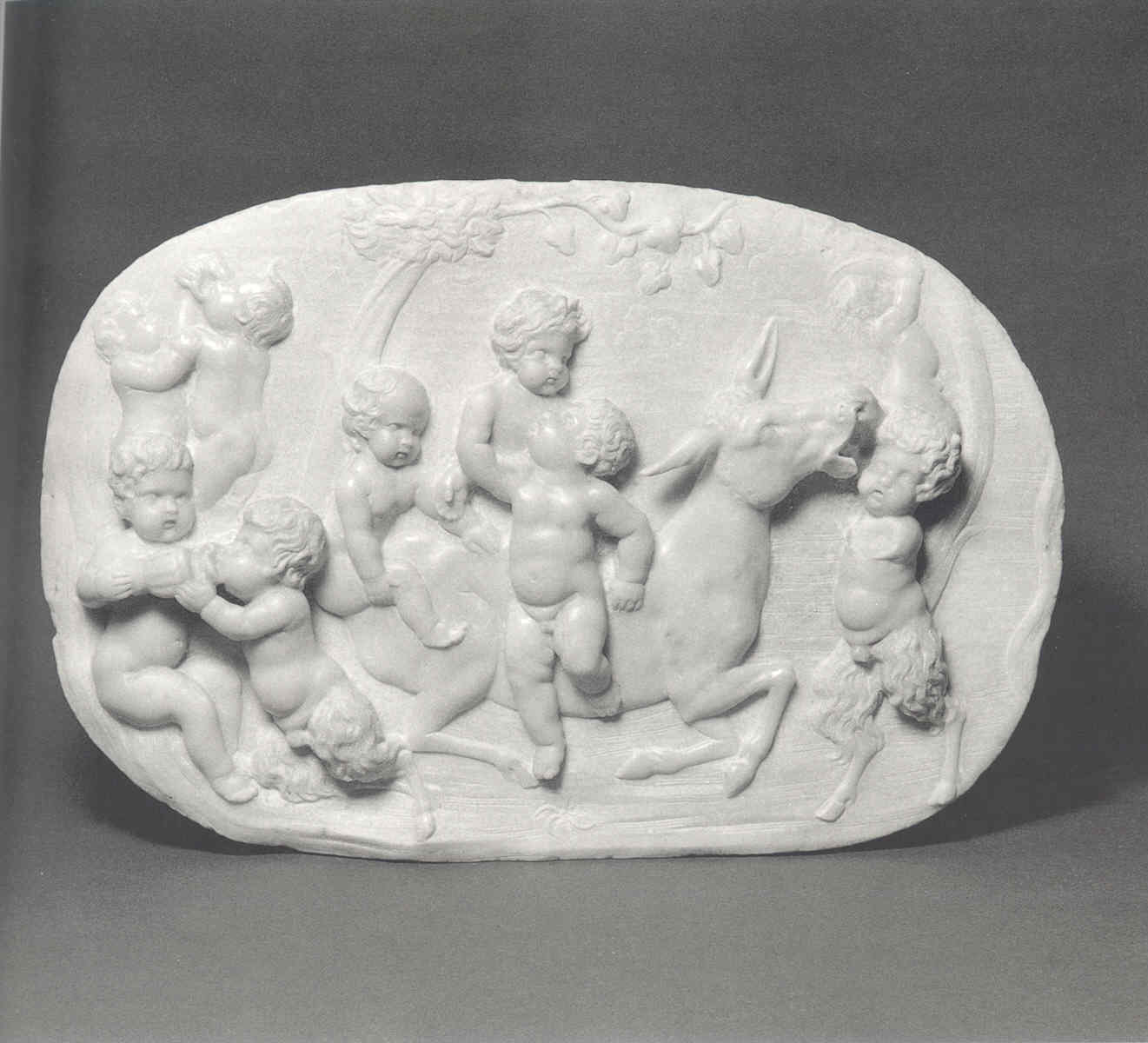 Altorilievo con puttini e satirelli, alcuni dei quali a cavallo di un asino di profilo al centro della scena, in atto di danzare o di bere. Sullo sfondo fronde d'alberi