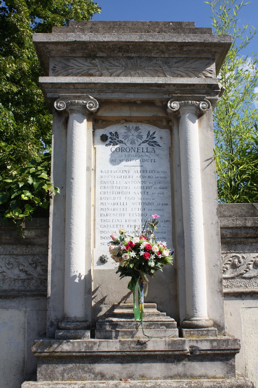 - NOTIZIE STORICO CRITICHE La "via della Confina" divide la parte del paese amministrata dal Comune di Vigarano Mainarda da quella afferente al Comune di Poggio Renatico. Bibliografia: A. Poggiali, I segni della guerra. Lapidi e monumenti, in Provincia di Ferrara, ai caduti italiani nel XX secolo, Claudio Nanni Editore, Ravenna 2012, vol. II, p. 256. Sitografia: http://www.pietredellamemoria.it/pietre/monumento-ai-caduti-di-coronella/