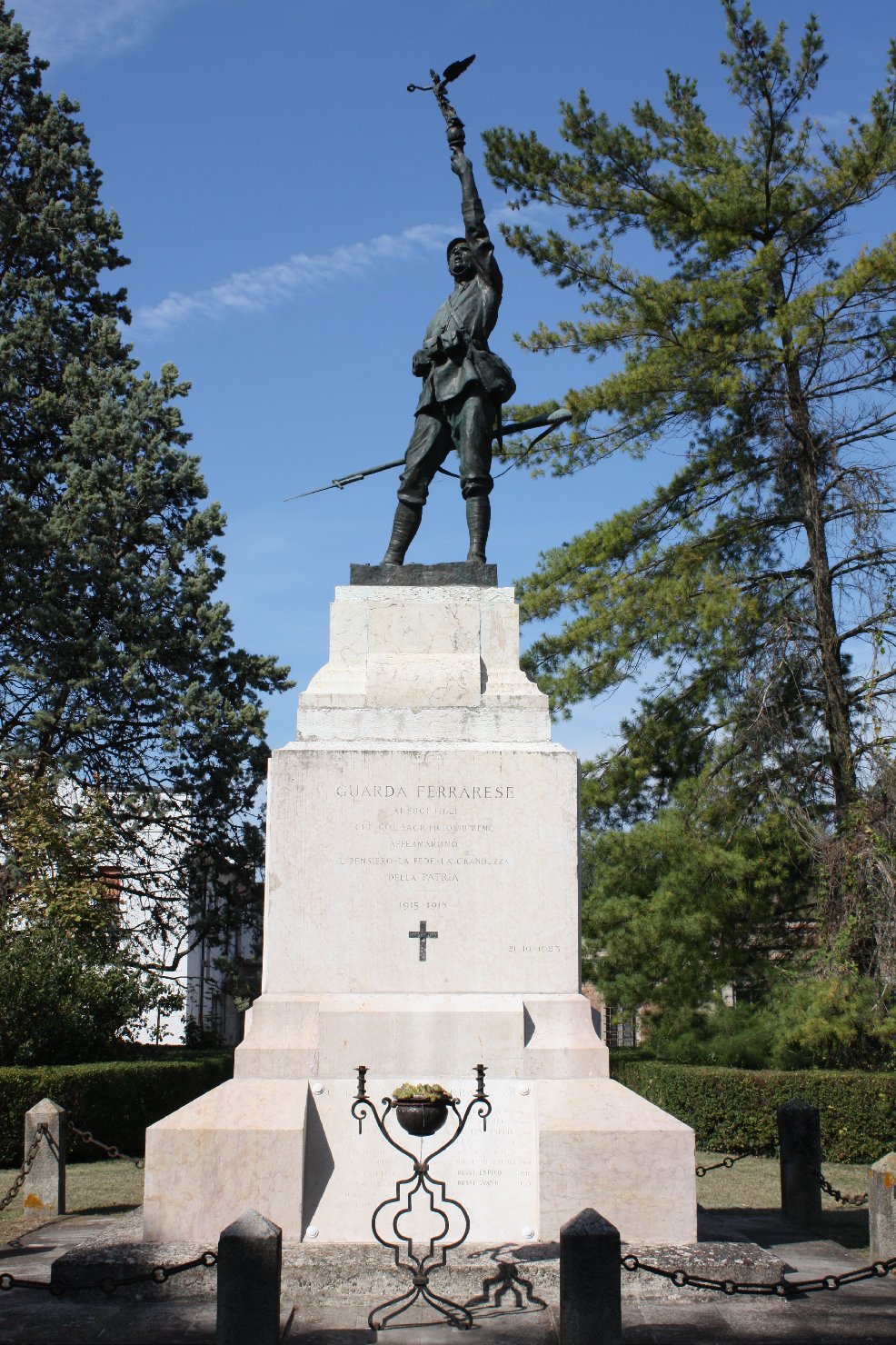 - ISCRIZIONI piedistallo, lato principale - GUARDA FERRARESE/ AI SUOI FIGLI/ CHE COL SACRIFICIO SUPREMO/ AFFERMARONO/ IL PENSIERO - LA FEDE - LA GRANDEZZA/ DELLA PATRIA/ 1915 - 1918/ 21 - 10 - 1923 - capitale - a incisione -