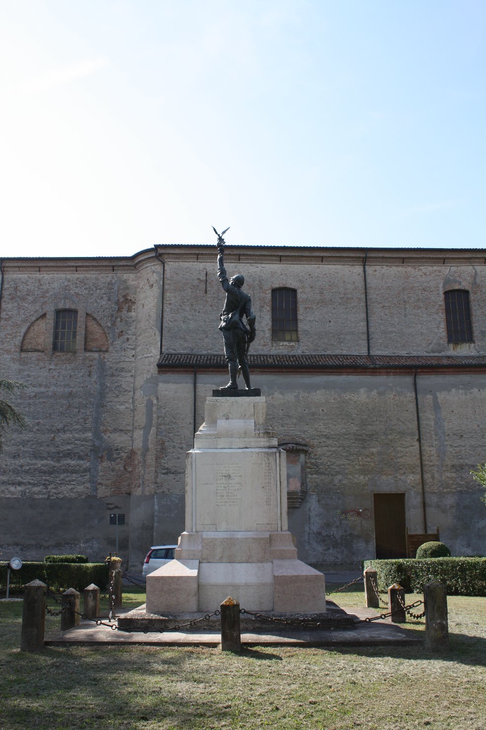 Il monumento è situato al centro di un giardino, sul fianco della chiesa parrocchiale che guarda il Po, uno dei luoghi in cui Riccardo Bacchelli ambientò il celebre romanzo Il mulino del Po. L’opera è circondata da bassi pilastrini in pietra uniti da una catena di ferro ed è costituita da un basamento in lastre di marmo di Carrara che regge la statua in bronzo di un fante. Il soldato, col viso rivolto al cielo, tiene con una mano il fucile e con l’altra solleva una statuetta di Vittoria alata che innalza a sua volta una corona di alloro