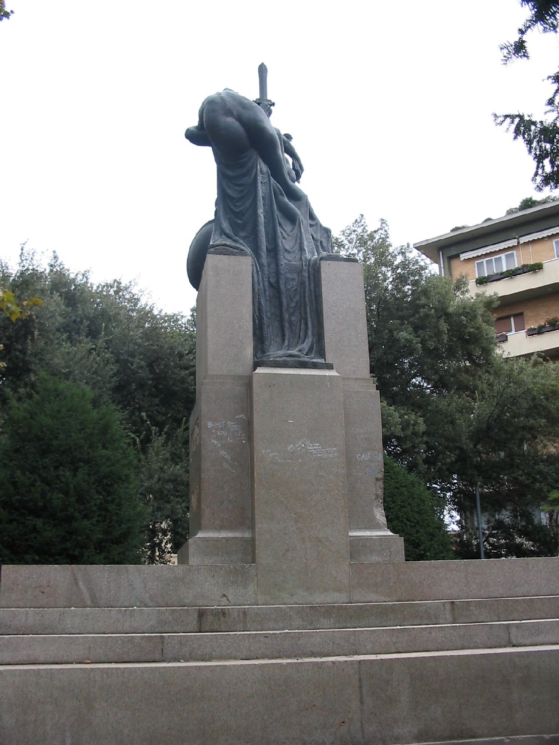 - NOTIZIE STORICO CRITICHE La scultura in bronzo è dominata dalla figura del Fante nudo, in posizione eretta e sguardo rivolto al cielo, con lo scudo e la spada protesa verso l'alto, nell'atto di offrirsi alla patria. Una figura femminile copre gli occhi del soldato, con i capelli e con il drappo che parzialmente la avvolge. Essa rappresenta la Gloria che, lasciate le vesti terrene per innalzarsi alla purezza divina, bacia sulla fronte l'eroe. La postura della donna è contorta e innaturale: mollemente adagiata dietro al corpo maschile, forma una curva che contrasta nettamente con la figura eretta del soldato. La prima pietra del monumento fu posta il 4 novembre 1922. Nello stesso anno, il Comitato Riminese pro Monumento e Onoranze ai Caduti in Guerra propose ad artisti italiani di presentare un bozzetto preparatorio per un monumento in bronzo e pietra da erigere nei giardini di Piazza Ferrari. All'inizio del 1923, la commissione giudicatrice, di cui faceva parte lo scultore Ercole Drei, affidò l'opera a Bernardino Boifava, autore anche dei bassorilievi alla base del monumento ai Caduti di Forlì e il monumento di Santarcangelo di Romagna. Il monumento fu inaugurato l'11 settembre 1926, alla presenza di re Vittorio Emanuele III. Bibliografia: A. Panzetta, "Nuovo dizionario degli scultori italiani dell'Ottocento e del primo Novecento", Edita da Adarte, Torino, nuova ed. 2003, vol. 1, p. 97. Sitografia: http://www.comune.rimini.it/comunicati/pagina376.html; http://www.lacivicacittadighedi.it/index.php?option=com_content&view=article&id=273:boifava-bernardino&catid=98:personaggi-illustri&Itemid=59, tratto da Bernardino Boifava, di Angelo Bonini; http://www.emiliaromagna.beniculturali.it/index.php?it/108/ricerca-itinerari/52/379