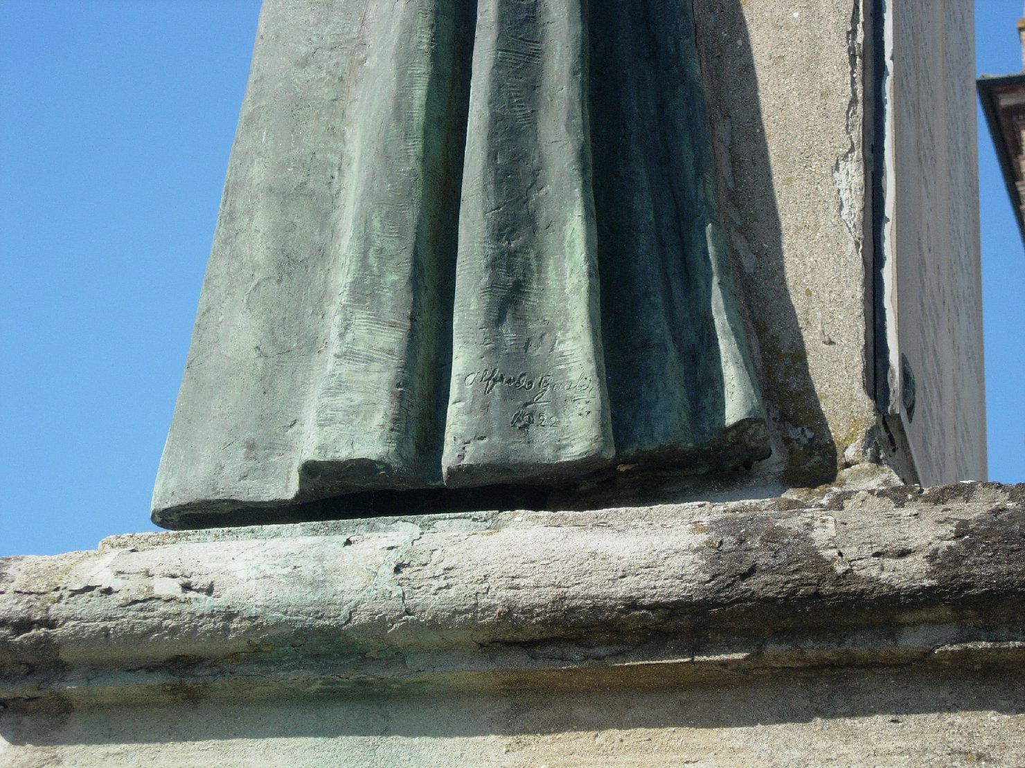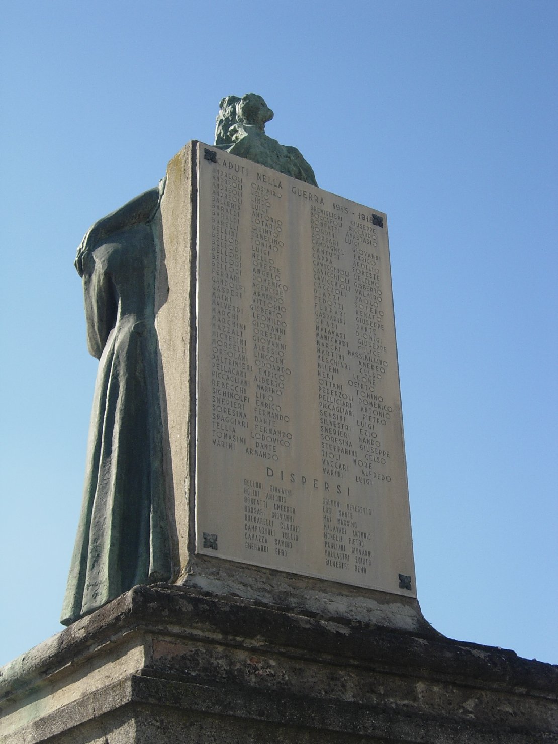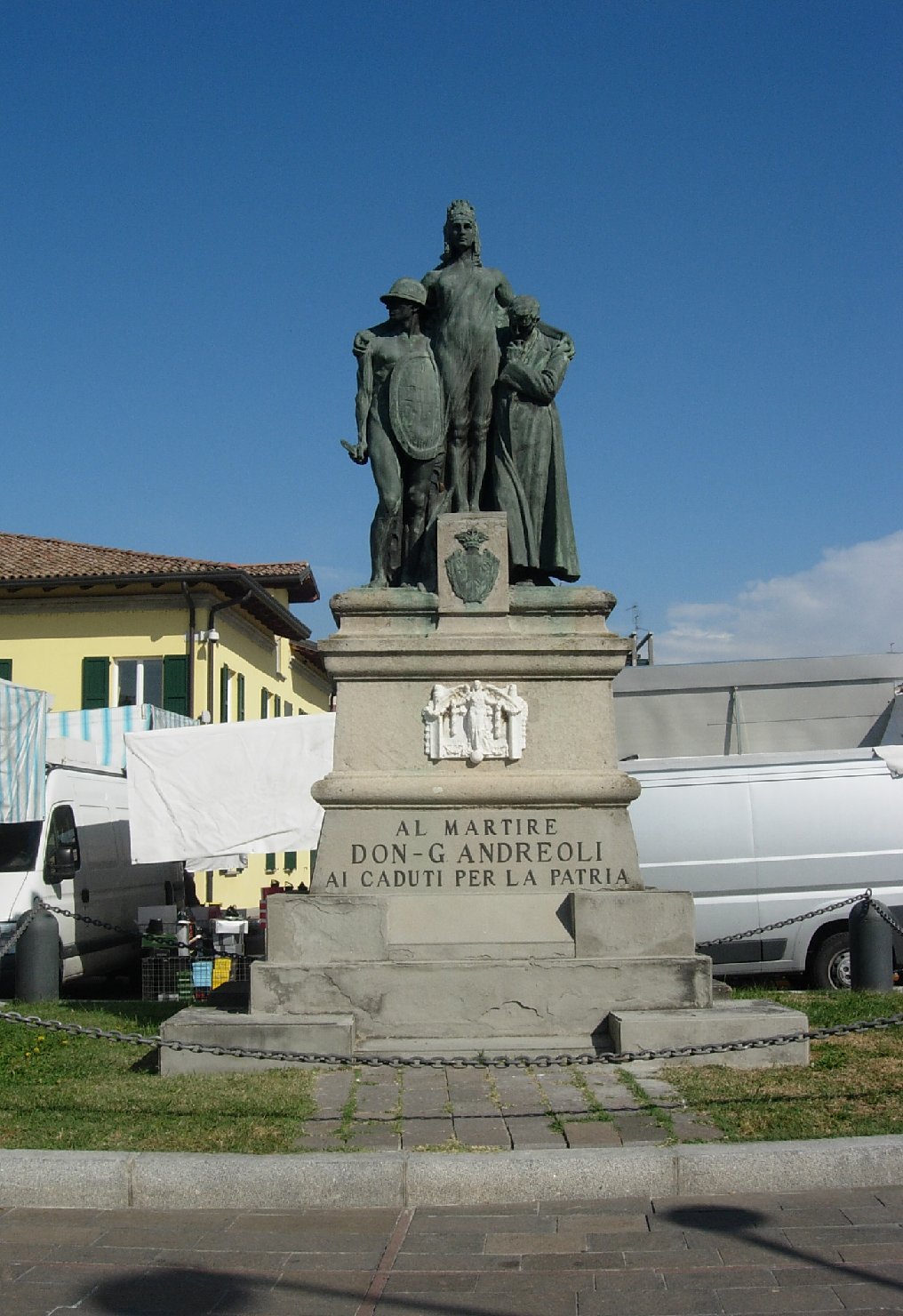 - NOTIZIE STORICO CRITICHE Il monumento ai Caduti di San Possidonio è dedicato anche a don Giuseppe Andreoli, figura emblematica della lotta per la libertà nelle guerre risorgimentali italiane. Nel gruppo scultoreo che si erge sopra il basamento il sacerdote figura accanto alla Patria (la Vittoria?) e ad un fante, a segnare lo stretto legame fra le battaglie e gli ideali risorgimentali e novecenteschi; ai lati del monumento sono incise le date 1822 e 1918. Il risultato visivo della presenza del sacerdote accanto alle altre due figure è di impatto notevole, considerando il forte legame della comunità con il suo parroco, rappresentato in meditazione e con il volto chino sorretto da una mano. Spicca invece per la qualità di definizione anatomica il fante. Nudo, con lo scudo nella mano sinistra, un pugnale nella destra e l’elmetto in testa, ha lo sguardo volto lontano, in netto contrasto con la figura meditativa di don Andreoli. In basso, nella targa al centro, la Vittoria alata, riproduzione di un originale ellenistico rinvenuto a Pompei nel 1823 e oggi conservato al Museo Archeologico di Napoli. Il gruppo scultoreo è firmato da Alfredo Gualdi sul fondo della tonaca del sacerdote. Fu inaugurato il 17 ottobre 1922 e si trova tuttora al centro della piazza principale del paese, intitolata anch’essa a don Andreoli. (Bibliografia e sitografia: L. Rivi, "Note sul monumento modenese ai caduti della prima guerra mondiale", in “Il Carrobbio”, 29, 2003, pp. 253-265, nota 18 p. 264; Alberto Barbieri, “A regola d’arte. Pittori Scultori Architetti Fotografi Scenografi Ceramisti Galleristi Critici e Storici d’arte nel Modenese dell’Ottocento e del Novecento”, Mucchi editore, 2008, pag. 139; G. Martinelli Braglia, Ottocento e Novecento a Modena, Modena, Toschi, 1997, p. 148; http://www.emiliaromagna.beniculturali.it/index.php?it/108/ricerca-itinerari/49/447)