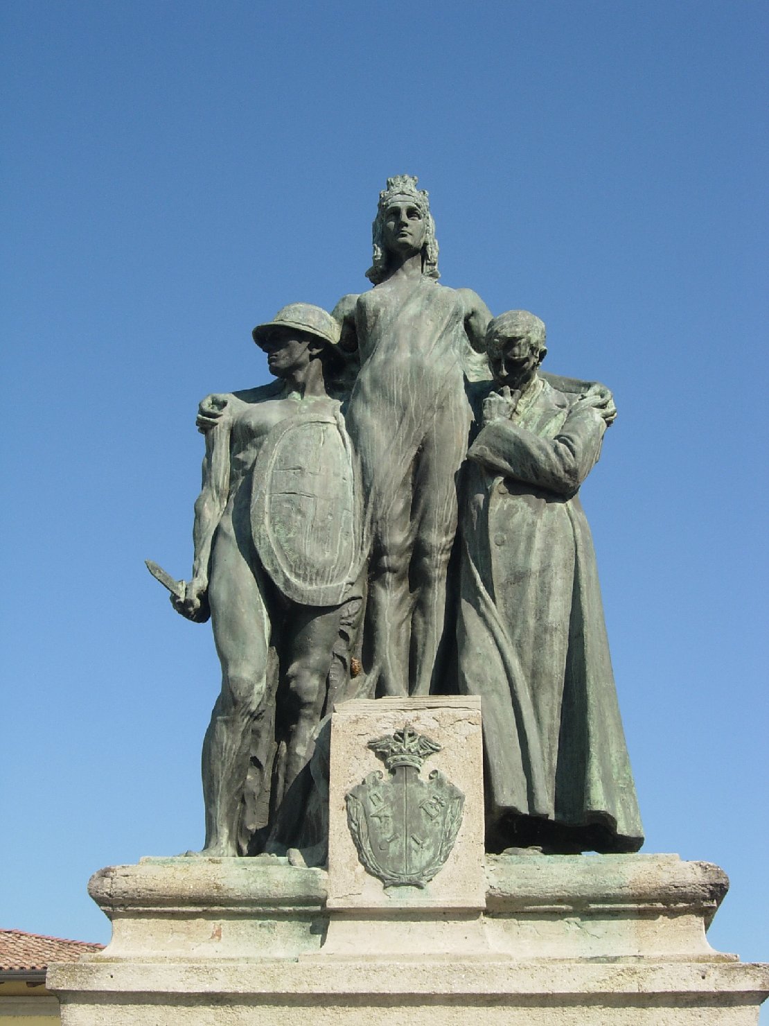 allegoria della Patria che abbraccia un soldato e un sacerdote