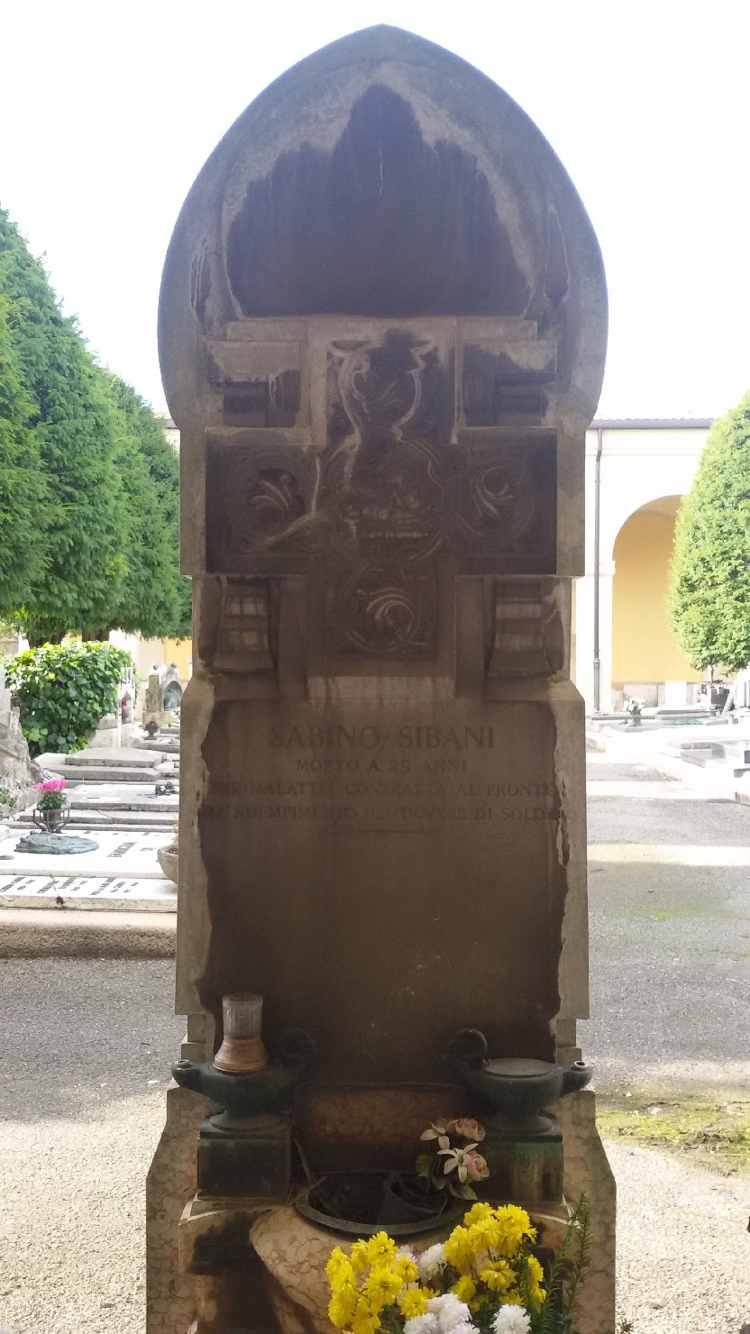 - ISCRIZIONI parte posteriore, al centro - SABINO SIBANI/ MORTO A 25 ANNI/ PER MALATTIA CONTRATTA AL FRONTE/ NELL’ADEMPIMENTO DEL DOVERE DI SOLDATO - capitale - a incisione -