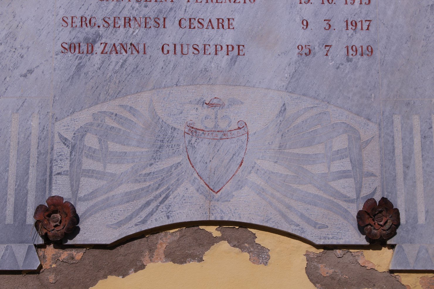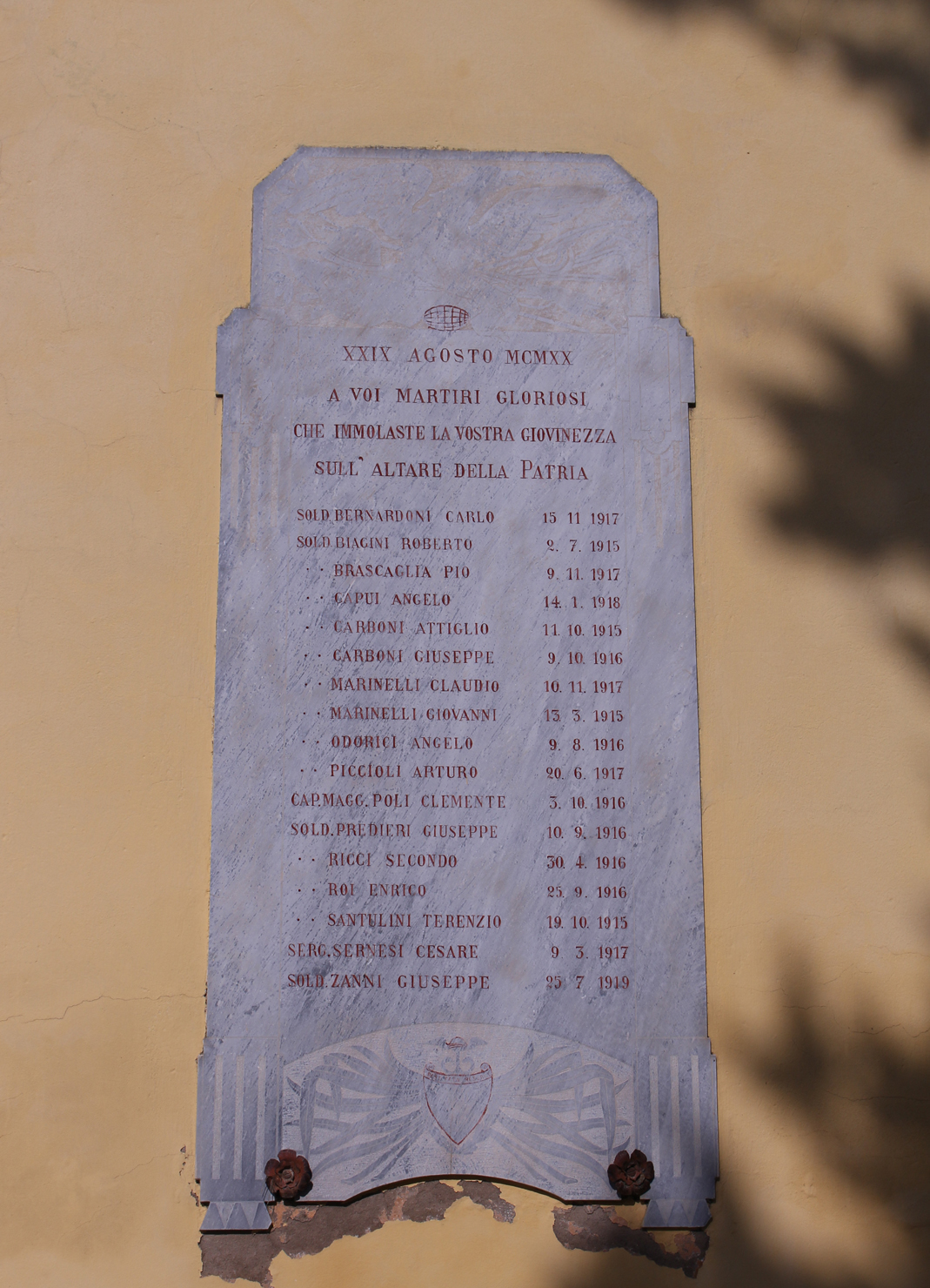 - ISCRIZIONI lapide di sinistra - XXIV AGOSTO MCMXX/ A VOI PRODI GENEROSI/ CHE SEGNASTE CON IL VOSTRO SANGUE/ I NUOVI CONFINI D’ITALIA/ SOLD. PARENTI ETTORE 17. 5. 1916/ SOD. BEDONNI ETTORE MUT. 23.5.1917/ SOLD. BEDONNI NICOLA 3.9.1917/ SOLD. BENELLI PAOLO 26.10.1918/ SOLD. BRASCAGLIA ARMANDO 10.10.1916/ SOLD. CAMPAZZI GIUSEPPE 11.6.1916/ SOLD. GIUSTI RAIMONDO MUT. 9.8.1916/ SOLD. IUBINI ROBERTO 15.6.1917/ SOLD. IUBINI SANTE 19.5.1917/ SOLD. LUPPI ANGELO 31.7.1917/ SOLD. LUPPI LUIGI 27.10.1917/ SOLD. PIANI ENRICO 15.6.1918/ SERG. PICCIOLI ANGELO 1.11.1915/ CAP. PICCIOLI GIACOMO 9.6.1915/ SOLD. PICCIOLI PIETRO 23.11.1917/ SOLD. POLI VENANZIO 20.8.1915/ SOLD. SCAGLIONI GIOVANNI 18.2.1918/ SOLD. SERNESI GIUSEPPE 12.9.1917 - maiuscolo - a solchi -
