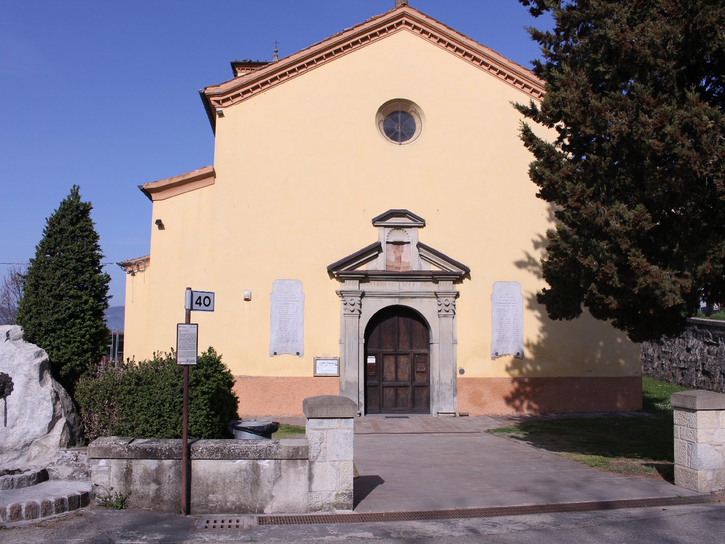 Lapidi identiche, in pietra serena e dal profilo mistilineo, affisse ai lati del portale della chiesa. Le iscrizioni, a solco, sono riempite di scagliola rossa mentre le decorazioni sono ricavate al negativo lasciando parte della superficie della lastra ruvida. Le uniche due porzioni di decorazione riempite, o nelle quali è rimasta, la scagliola rossa sono una bomba a mano in alto e uno scudetto in basso. In basso, in entrambe le lapidi, sono fissate due rose in metallo