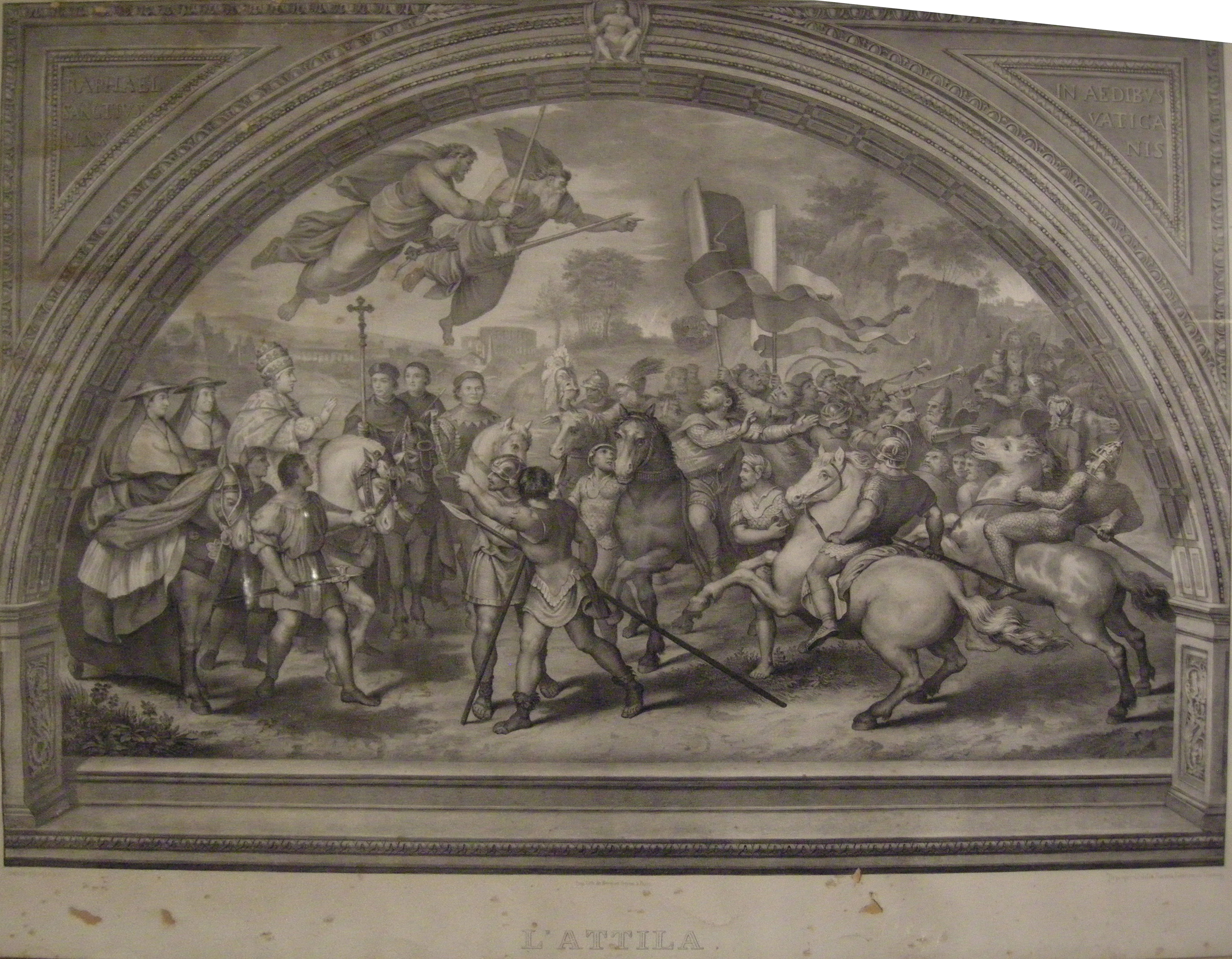 - NOTIZIE STORICO CRITICHE La litografia, che riproduce l'affresco di Raffaello Sanzio e aiuti con l'incontro tra Leone Magno e Attila nella Stanza di Eliodoro dei Palazzi Vaticani, proviene dalla collezione dello scultore Lorenzo Bartolini. Appartenuta a Giulia Bartolini, figlia di Lorenzo, l'opera è entrata a far parte della collezione sul finire degli anni Sessanta dell'Ottocento, quando Giulia, a seguito del matrimonio con Cesare Fagnani Pani (1869), si trasferì da Firenze nel palazzo riminese, portando con sé diversi esemplari del patrimonio paterno, tra cui sculture, dipinti, stampe, disegni, taccuini, lettere, cimeli, parte della biblioteca e una notevole raccolta di fotografie che raffigurano l'entourage di Bartolini, realizzate da importanti studi attivi nella seconda metà del XIX secolo (Alinari, Brogi, Alvino, Montatone, Powers, Schemboche, Hautmann) (Cardi 2011, p. 3). "Grazie a Giulia Bartolini, casa Fagnani Pani ampliò notevolmente il proprio circuito di relazioni divenendo un importante raccordo per la cultura italiana tra Otto e Novecento, per le relazioni tra Rimini e le più importanti città italiane ed europee" (si veda M. Cavalli, Collezione Fagnani Pani Cardi di Rimini. Dipinti, sculture, disegni, cimeli, tessuti, mobili e oggetti d'arredo nel Provvedimento di tutela DDR 236_84 del 2015 in allegato)