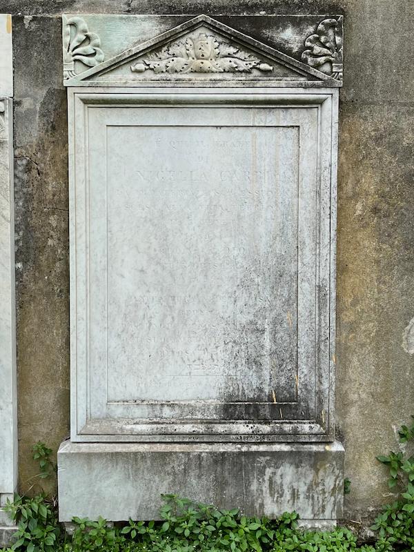 - ISCRIZIONI al centro - È qui il frale / di Nigella Carpi / la immateriale sua assenza / scese alla vita terrena il 5 tevet / 5591 / rediva a Dio / il 5 kislew / 5617 / anima pura e affettuosa / redenta / da lunghe penose infermità/ del suo mortale involucro / ella riposa ora in cielo / תנצב״ה - capitale -