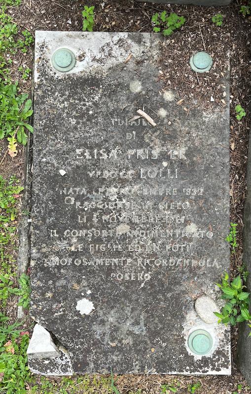 - ISCRIZIONI al centro - תנצב״ה / Sul tumulo Elisa Prister ved. Lolli nata il 12 novembre 1832 / raggiunse il cielo il 4 novembre 1914. Il consorte indimenticato / le figlie ed i nipoti amorosamente ricordandola posero - CARATTERI LATINI CAPITALI -