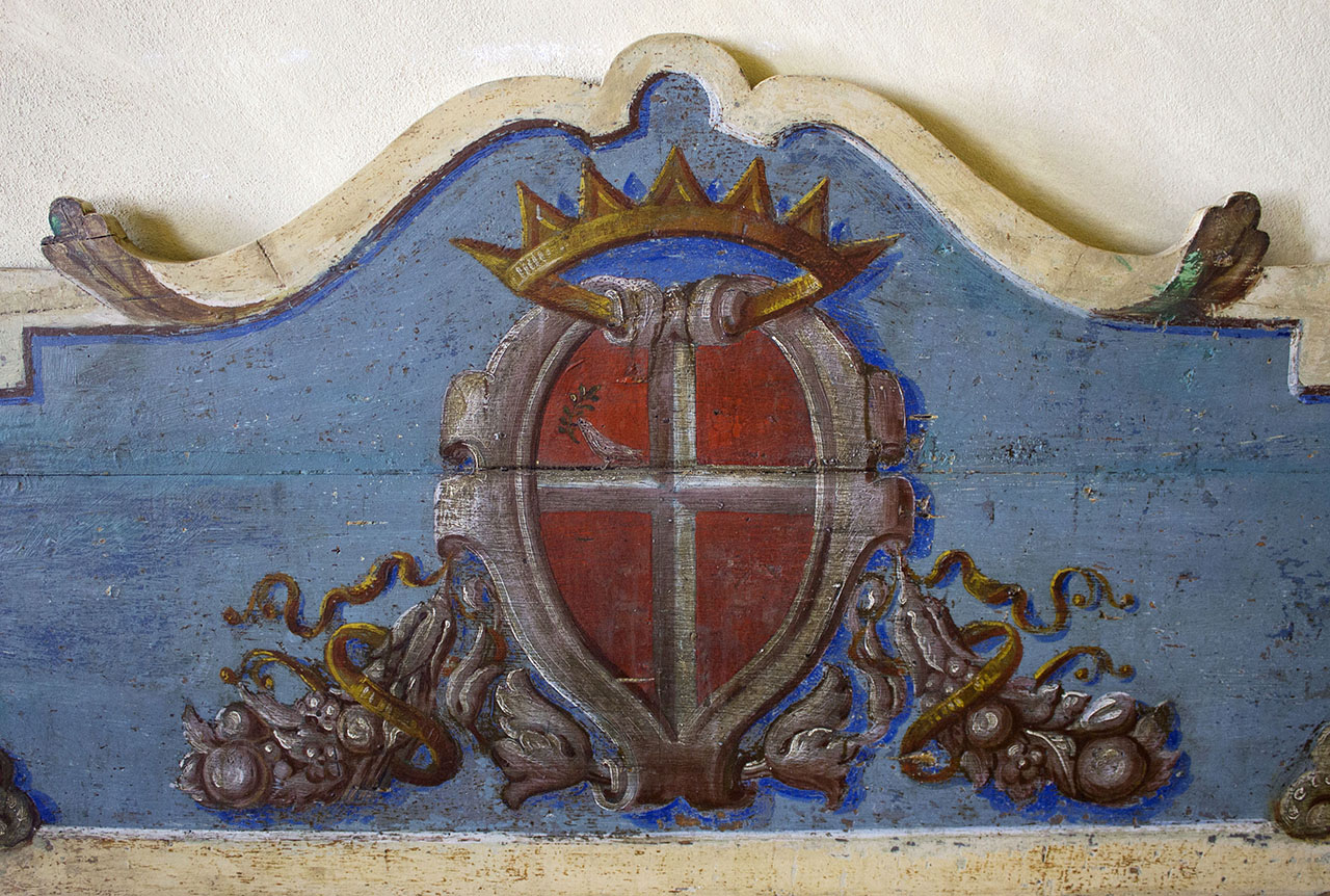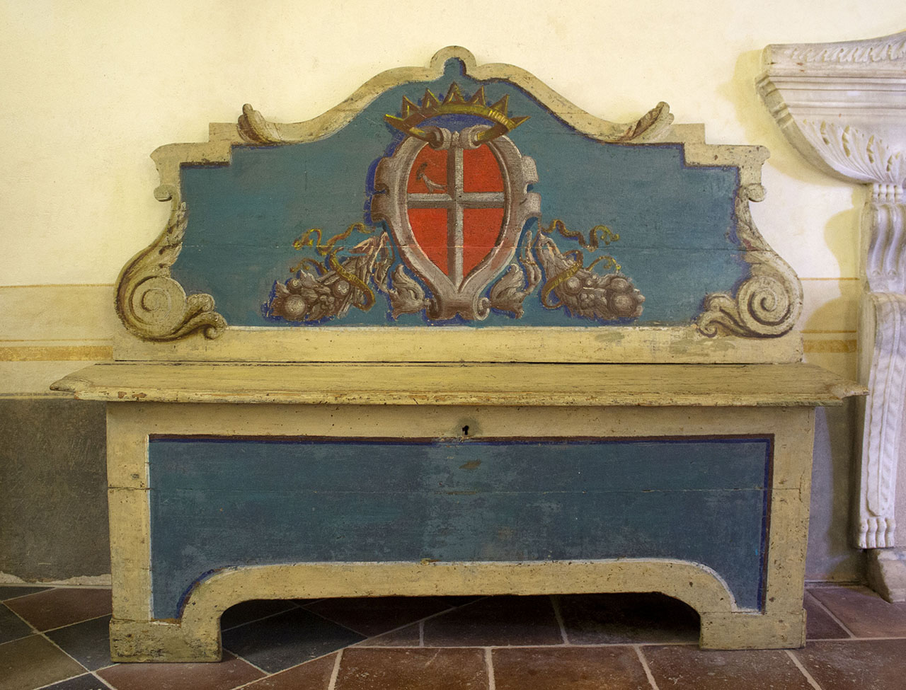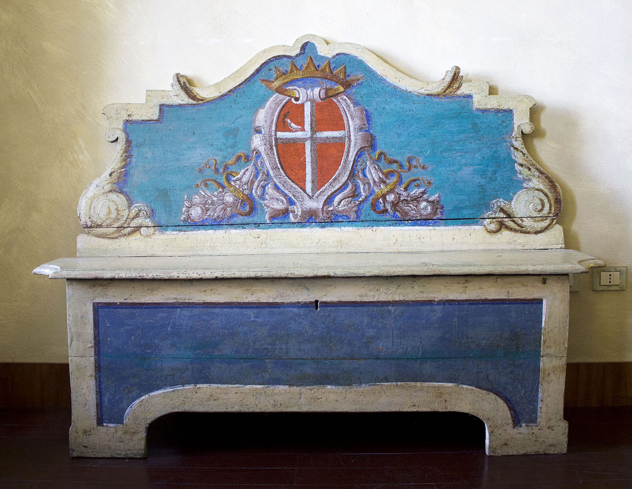 - NOTIZIE STORICO CRITICHE La conformazione di questa cassa dipinta risponde ad uno schema che ebbe larghissima diffusione nell'Italia centro-settentrionale nel XVII secolo, in questo caso databile al XIX secolo. Nati con intento celebrativo e di apparato, questi arredi trovavano per lo più collocazione negli androni e negli scaloni dei palazzi. Nel dossale è dipinto l’antico stemma del Comune di Lugo, ancora con la corona comitale e non quella turrita