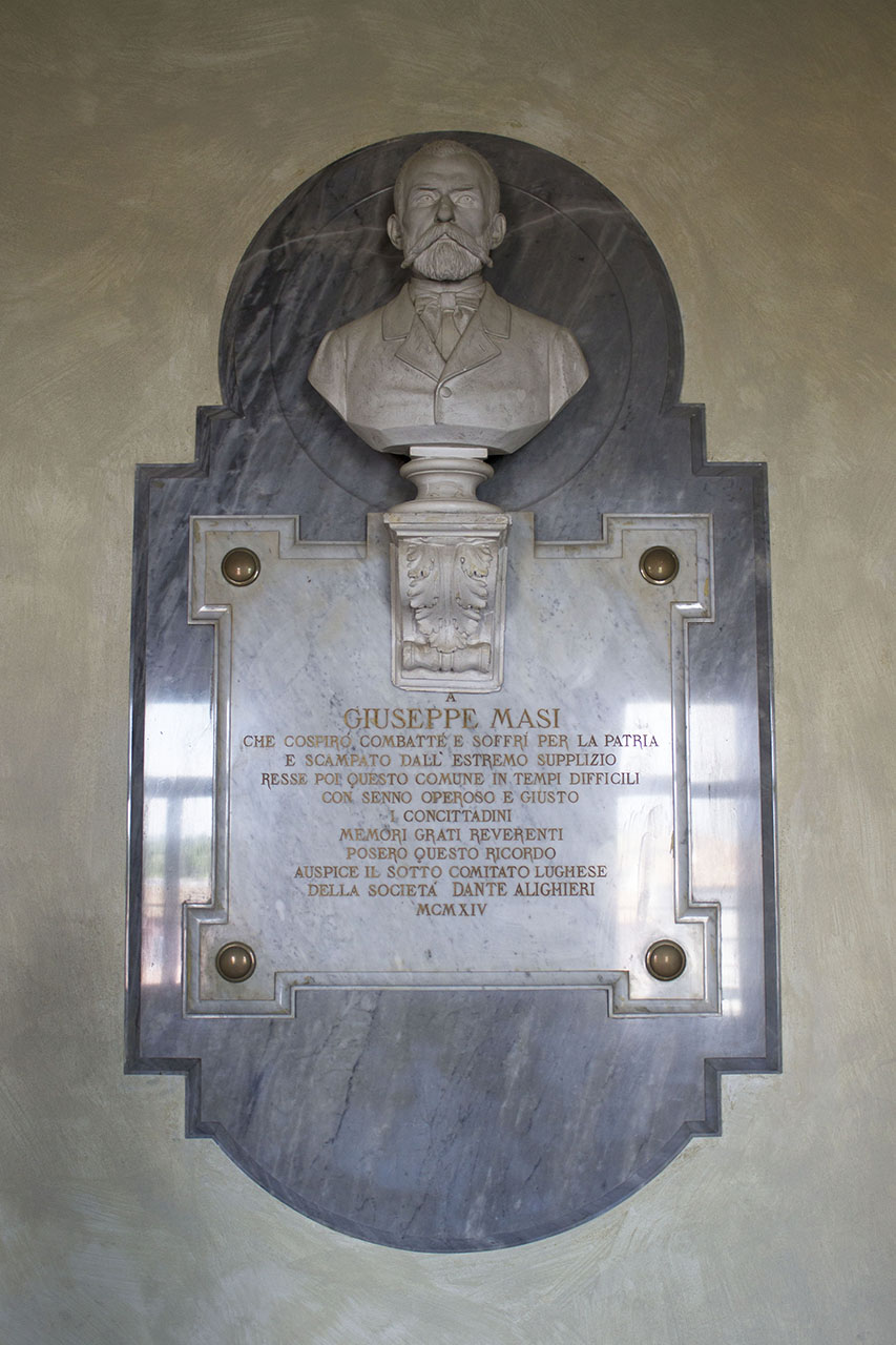 - ISCRIZIONI lastra in basso - A/ GIUSEPPE MASI/ CHE COSPIRO' COMBATTE' E SOFFRI' PER LA PATRIA/ E SCAMPATO DALL'ESTREMO SUPPLIZIO/ RESSE POI QUESTO COMUNE IN TEMPI DIFFICILI/ CON SENNO OPEROSO E GIUSTO/ I CONCITTADINI/ MEMORI GRATI REVERENTI/ POSERO QUESTO RICORDO/ AUSPICE IL SOTTO COMITATO LUGHESE/ DELLA SOCIETA' DANTE ALIGHIERI/ MCMXIV - capitale -