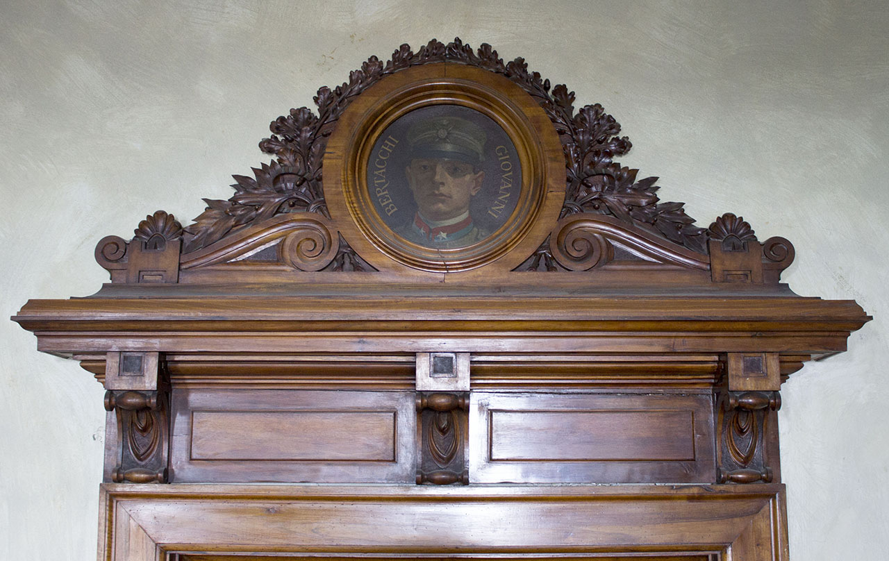 Porta a due ante in legno di noce intagliato, con alla sommità un medaglione scolpito in noce sopra la cimasa della porta. All'interno del tondo è dipinto il volto di Bertacchi Giovanni in uniforme con scritto il nome. Ai lati del medaglione sono due volute e intorno rami di alloro e di rovere legati da nastri. Sotto il piano che sorregge la cimasa, sono poggiate tre mensole con intagliati due elementi a goccia, una dentro l'altra. Ogni anta è costituita da tre specchiature, quella grande al centro e due piccole alle estremità