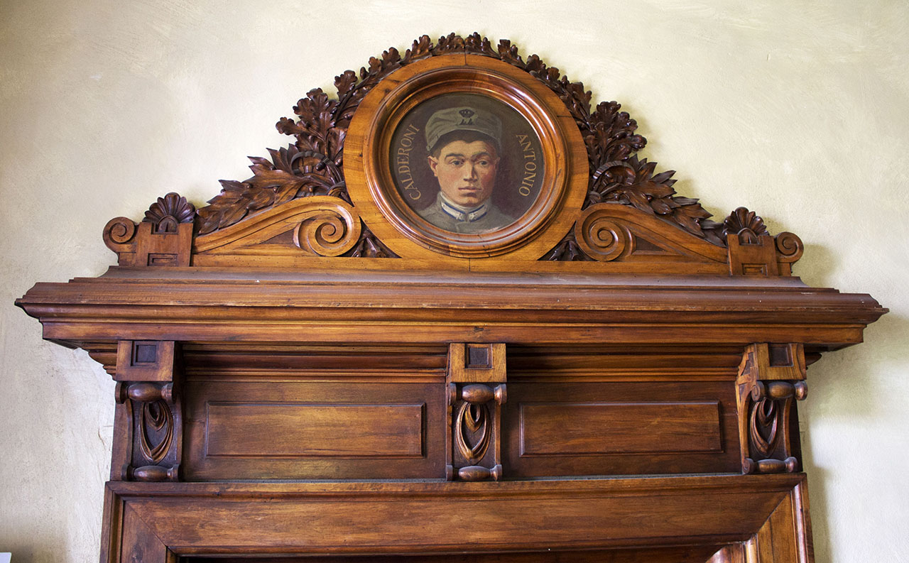 Porta a due ante in legno di noce intagliato, con alla sommità un medaglione scolpito in noce sopra la cimasa della porta. All'interno del tondo è dipinto il volto di Antonio Calderoni in uniforme incorniciato dal nome. Ai lati del medaglione sono due volute e intorno rami di alloro e di rovere legati da nastri. Sotto il piano che sorregge la cimasa, sono poggiate tre mensole con intagliati due elementi a goccia, una dentro l'altra. Ogni anta è costituita da tre specchiature, quella grande al centro e due piccole alle estremità