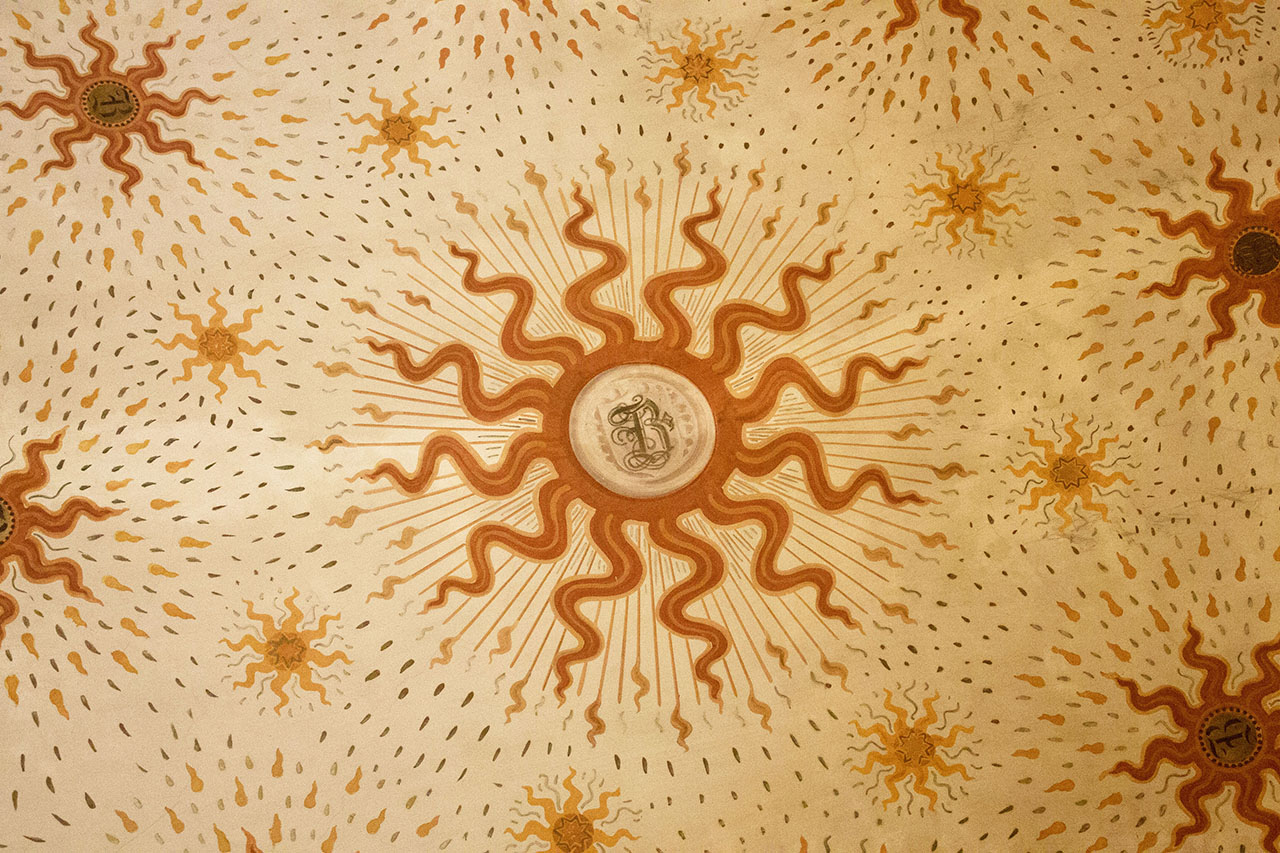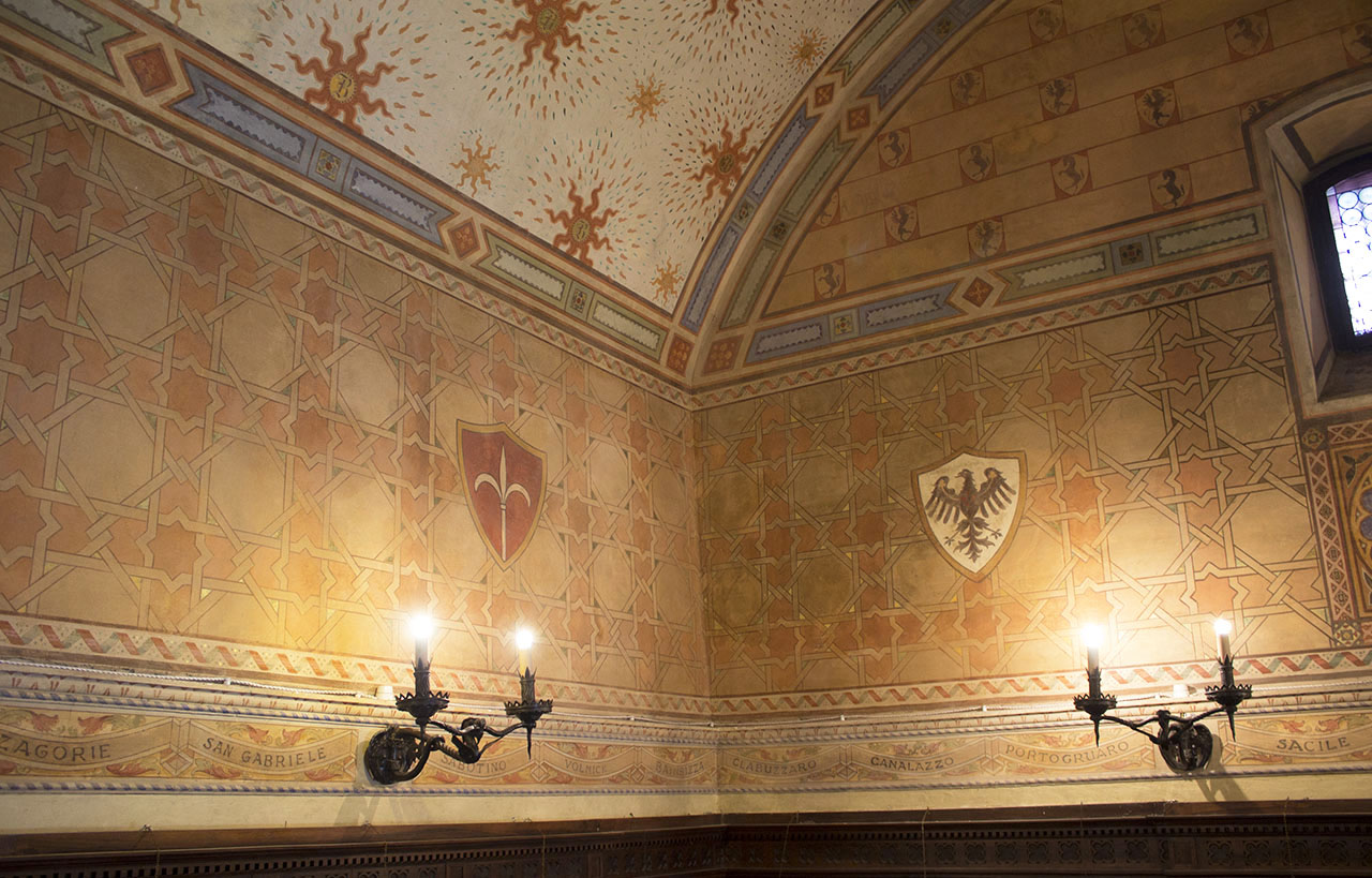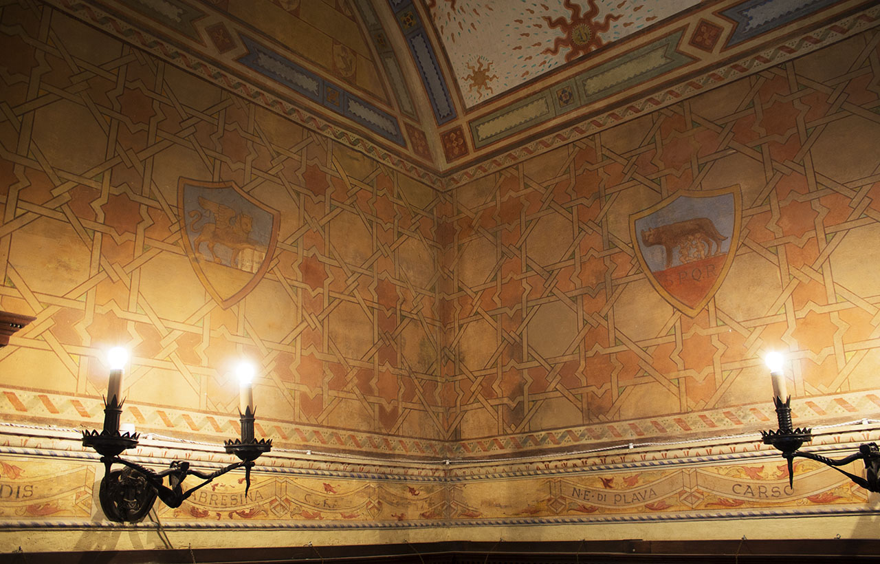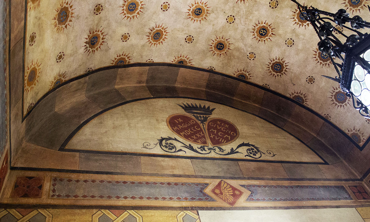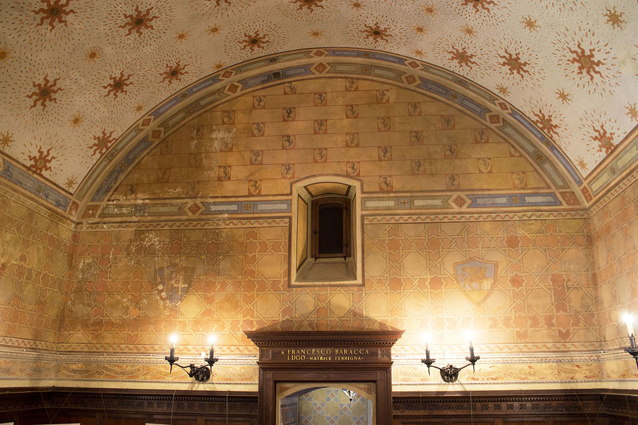 Decorazione a fresco all'interno della Sala Baracca, la parte superiore delle pareti e la volta a botte. Sulla volta sono raffigurate stelle di due grandezze con al centro le iniziali di Francesco Baracca. Sopra il postergale gira per tutto il perimetro un fregio suddiviso in trentaquattro scomparti, ognuno dei quali contiene il nome delle località dove Baracca ottenne le sue vittorie durante la Grande Guerra, scritte su un nastro accompagnato da motivi a foglia. Il fregio è incorniciato da un decoro a corda, sia sotto che sopra; in alto sono dipinte altre cornici più elaborate. La fascia centrale, la più alta, che corre lungo tutta la stanza, è caratterizzata da un intreccio di nastri che formano rombi e stelle a otto punte, e stemmi di città (due o tre su ogni parete). Tra la parete e la volta è raffigurata una cornice colorata formata formelle quadrate o rombi alternati a nastri colorati. Le lunette nelle pareti est e ovest sono ornate da varie fasce con piccoli stemmi del cavallino rampante alternati agli stemmi con il grifo della 91a Squadriglia. Anche l'ambulacro riprende quasi gli stessi decori della sala