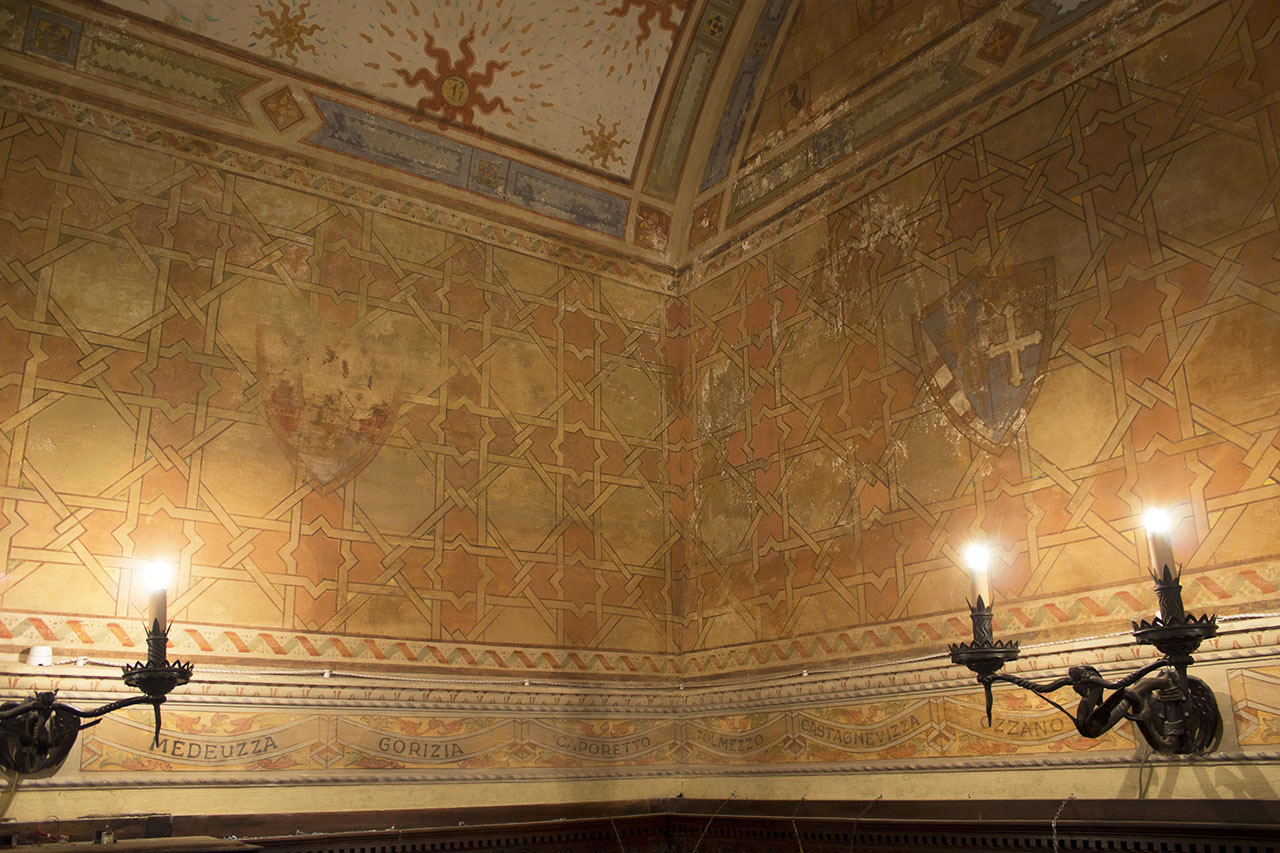 - ISCRIZIONI parete ovest, fregio sopra postergale - TOLMEZZO/ CASTAGNEVIZZA/ OZZANO/ MERNA// GRADIS/ NEBRESINA/ CORA(..)/ [---] - capitale -