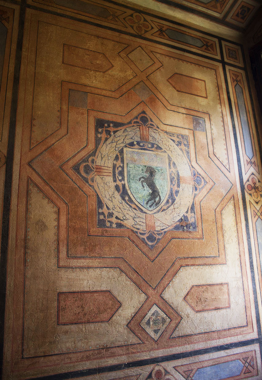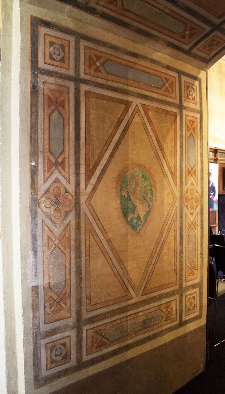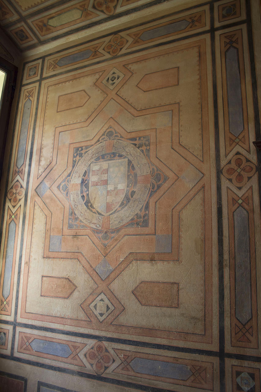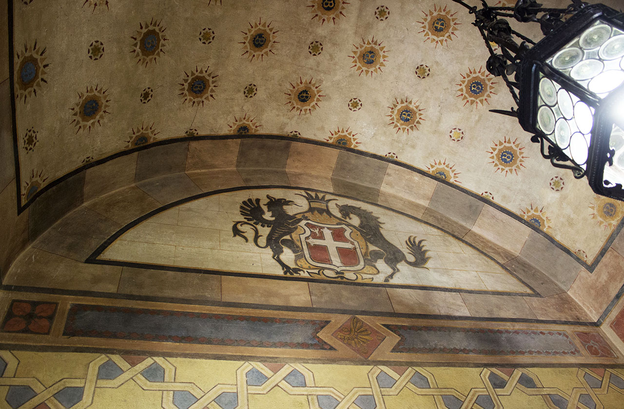- STEMMI parete ovest, a sinistra - civile - Stemma - trinciato: nel 1° d'azzurro, al leone coronato passante nel verso della partizione d'oro e croce bianca; nel 2° d'argento, a tre sbarre di rosso
