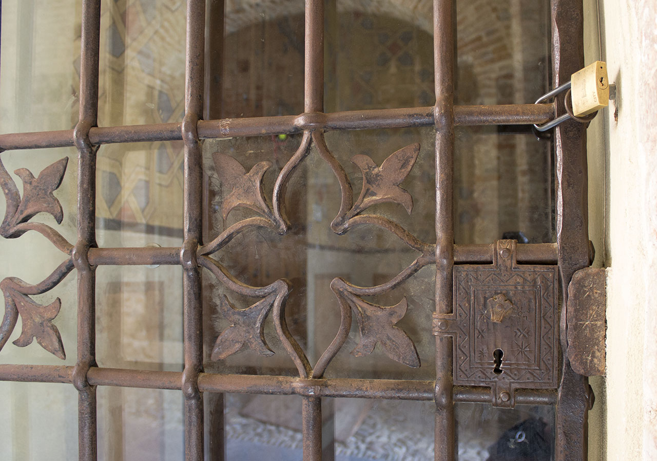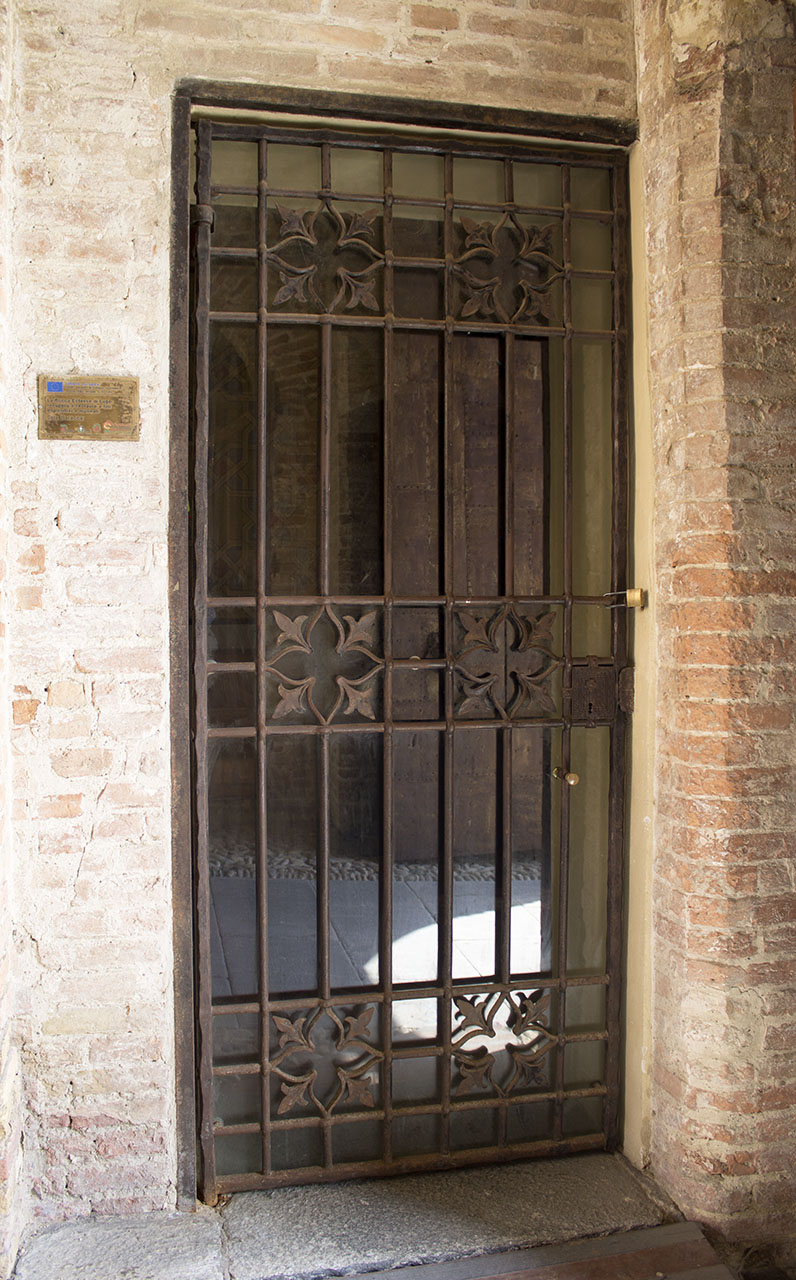 Cancello in ferro battuto con listelli verticali e orizzontali con elemento decorativo ripetuto sei volte: quadrilobo con fogliette a tre punte. La serratura è decorata da motivi a zig zag e stellette