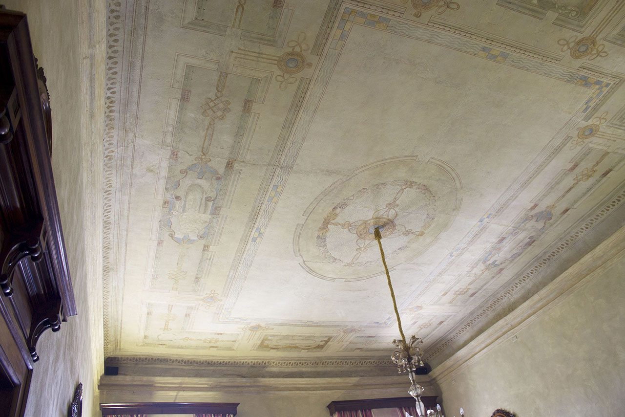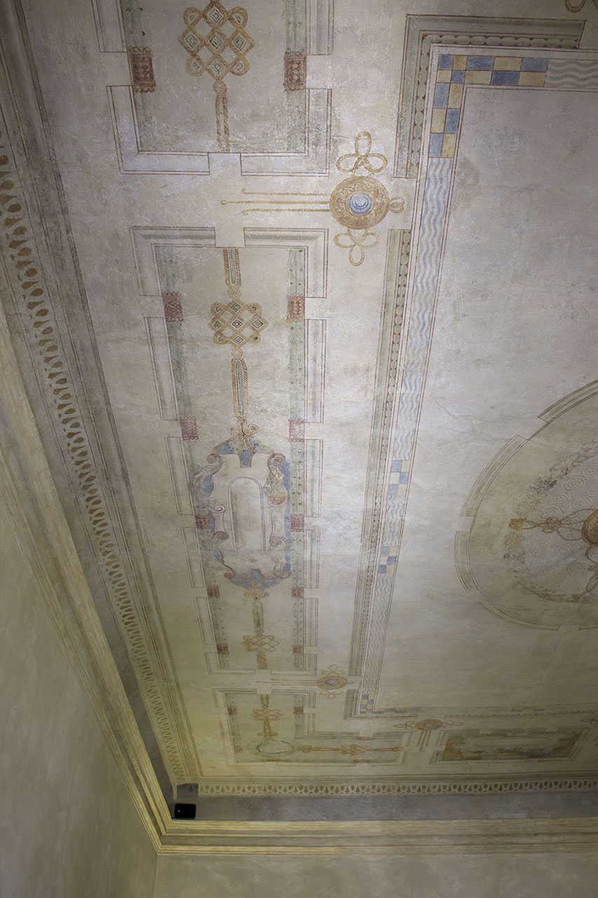 Soffitto dipinto a fresco. La base della volta poggia su una cornice modanata che corre lungo tutto il perimetro. Segue una cornice dipinta raffigurante degli ovoli seguiti da un finto bordo a rilievo. Dopo un breve spazio, sono rappresentate finte aperture rettangolari o a L dove sono dipinti vari motivi decorativi: corde che si intrecciano e che uniscono cartigli, uno su ogni lato, e ghirlande nei quattro angoli; due giri di festoni stilizzati; negli spazi esterni si alternano medaglioni. Segue un'altra finta cornice con motivi a dischi e una a onde. Al centro è rappresentato un ovale che circoscrive una ghirlanda di frutta e spighe di grano, con un nastro intrecciato. La ghirlanda è retta da corde intrecciate con vari nodi che raggiungono un medaglione centrale; sullo sfondo sono disegnati motivi a girali