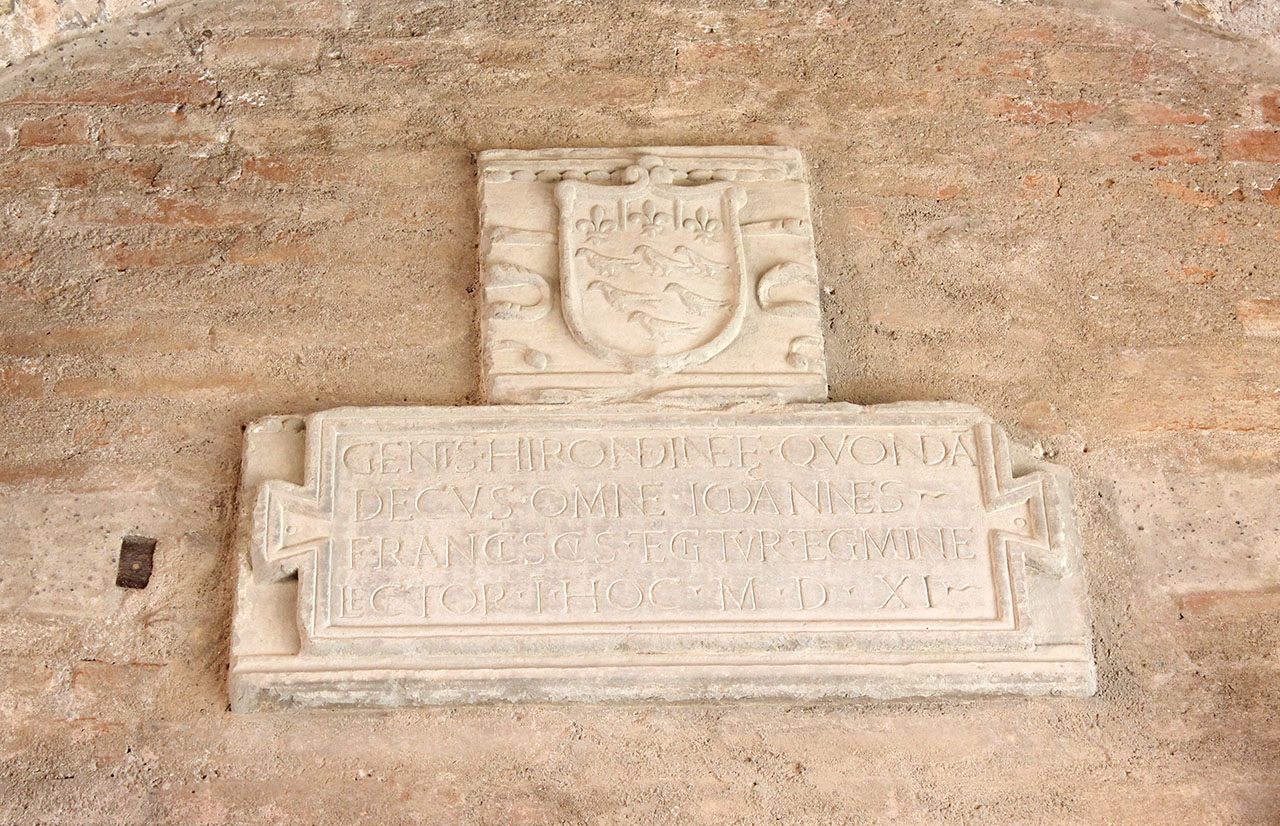 - ISCRIZIONI dentro la lapide - GENTIS.HIRONDINEE.QUONDA/ DECUS.OMNE.IOANNES/ FRANCISCUS.TEGITUR.TEGMINE/ LECTOR.I.HOC.M.D.XI - capitale -