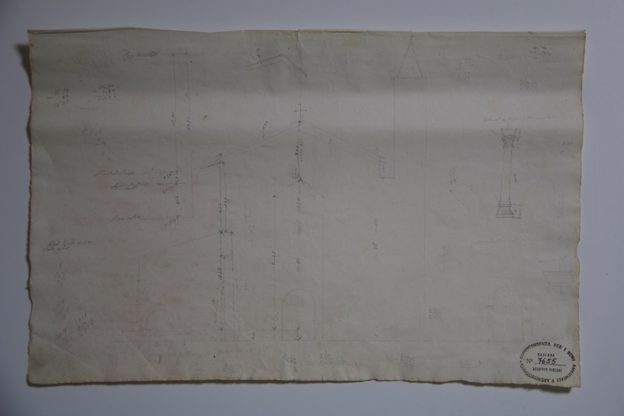 Disegno a matita su carta. Rilievo in alzato con le quote di livello del fronte esterno della basilica di San Giovanni Evangelista di Ravenna e rilievo di una colonna antica della navata