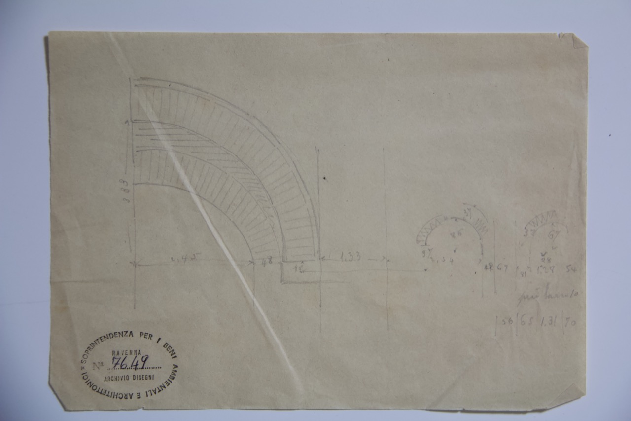 Disegno a matita su carta liscia. Rilievo in alzato degli arconi sovrapposti nel muro perimetrale della navata sinistra della basilica di San Giovanni Evangelista di Ravenna