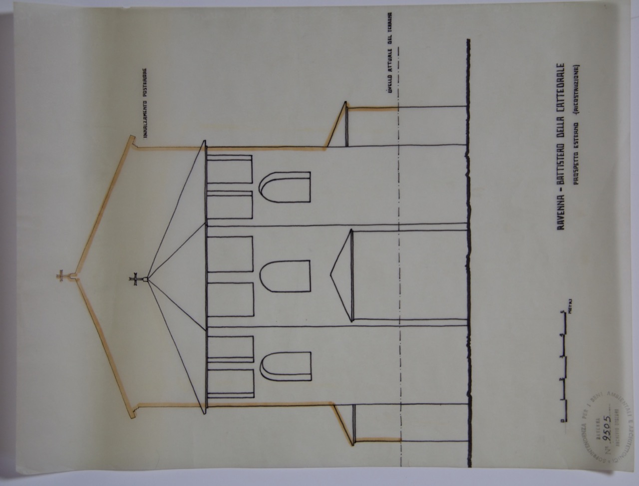 Disegno a china nera e pennarello color terra di Siena su carta lucida. Prospetto esterno del Battistero Neoniano di Ravenna, ricostruzione, con l’innalzamento posteriore ed il livello del terreno attuale. Scala 1 metro = a cm 1,5