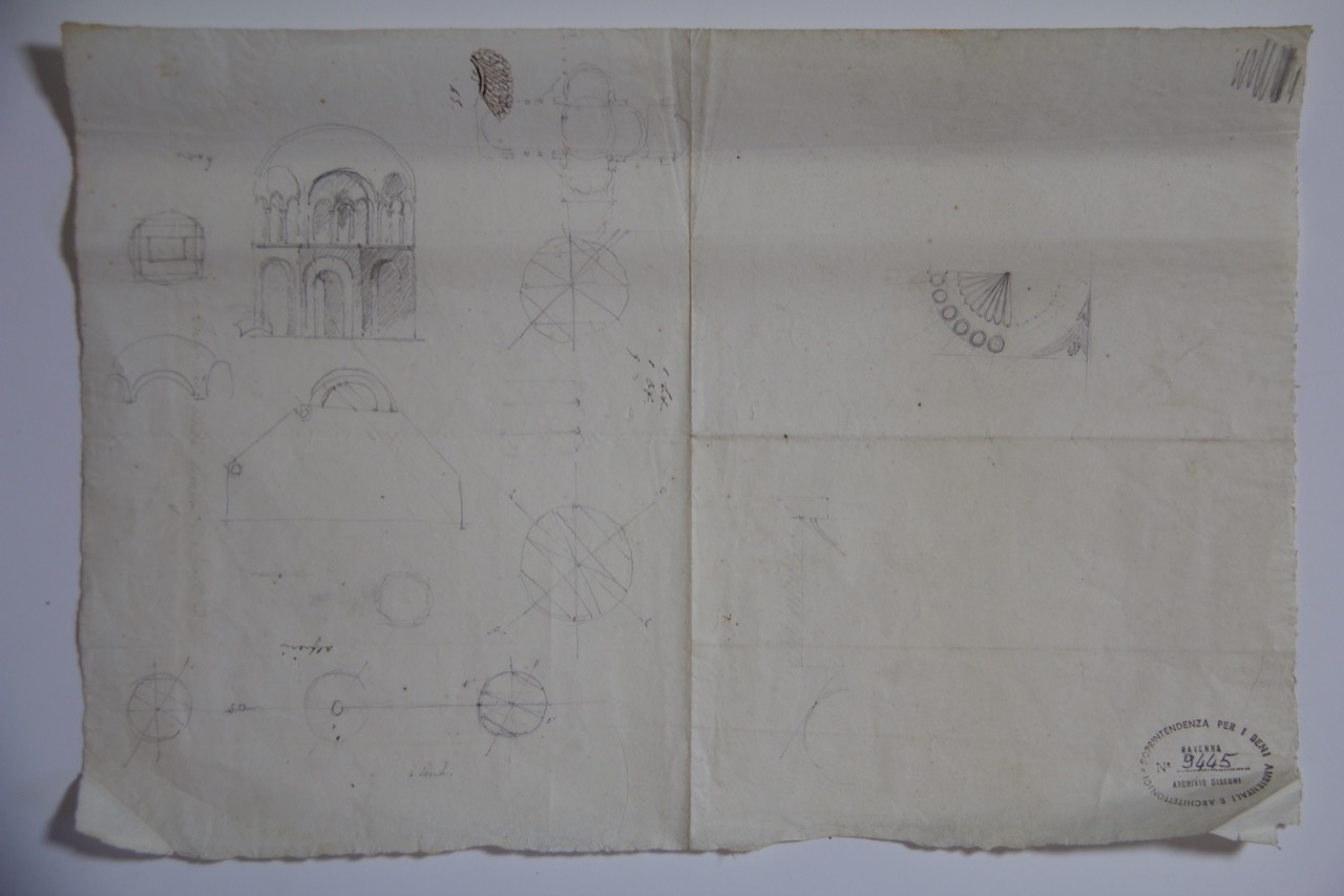Disegno a matita e penna seppia su carta sottile. Vari schizzi. Interno del Battistero Neoniano di Ravenna, pianta di una chiesa, decorazioni e costruzioni geometriche