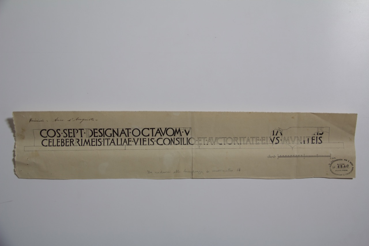 Disegno a china nera su carta. Iscrizioni di nomi sull'Arco di Augusto di Rimini. Scala 1:20
