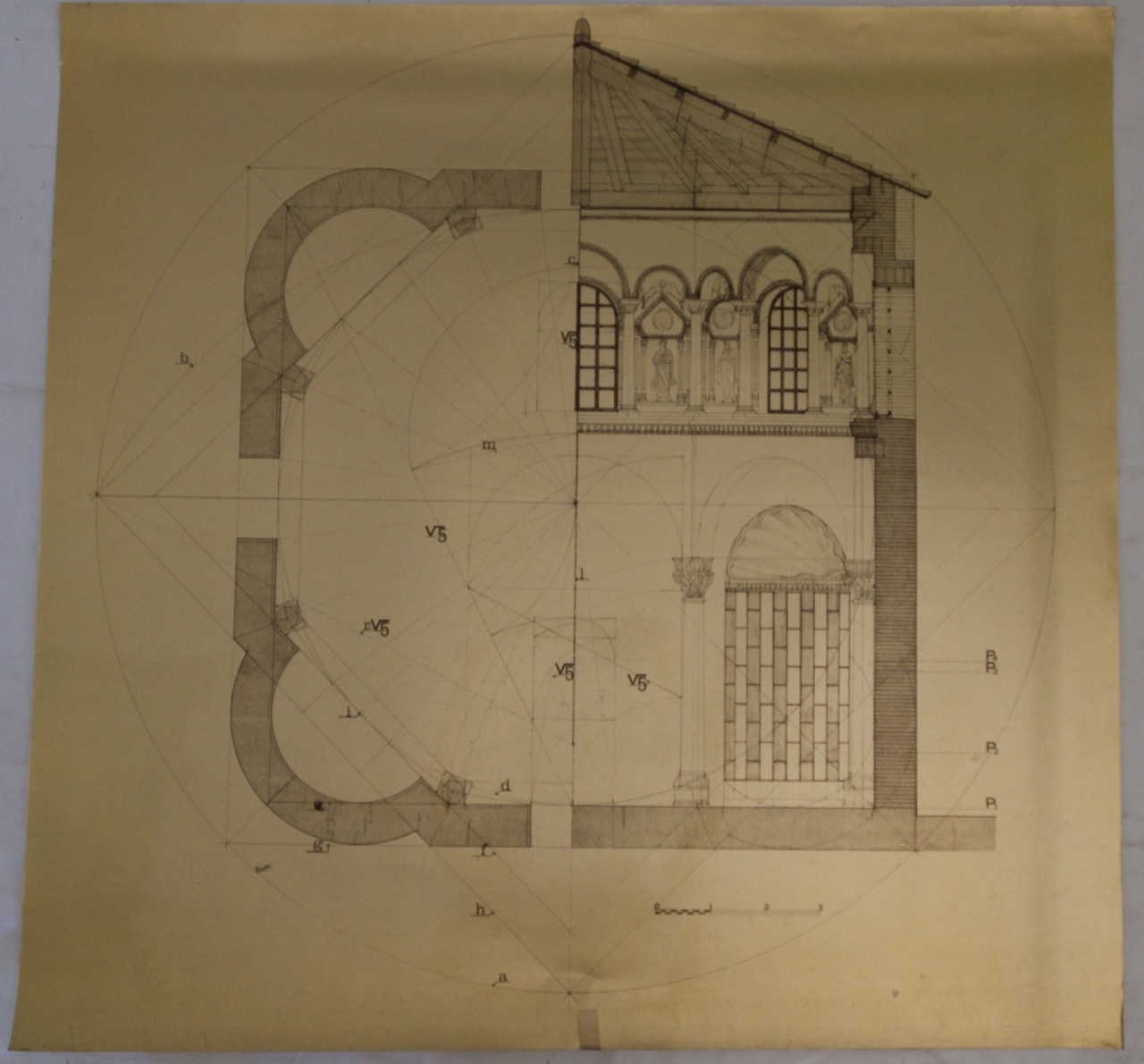 Disegno a inchiostro di china su carta metallizzata. Costruzione geometrica della pianta e della sezione del Battistero Neoniano di Ravenna, disegnata con i metodi della geometria e dei rapporti armonici