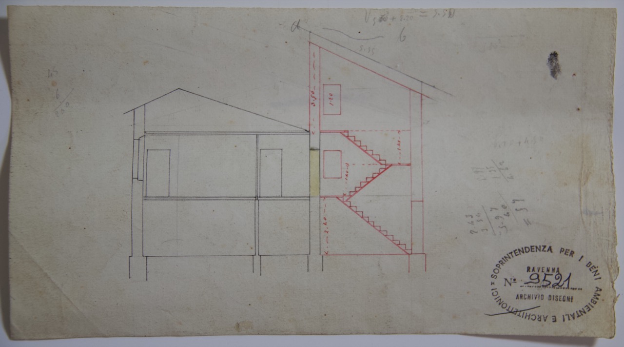 Disegno a china nera e rossa, matita e acquerello su carta da disegno. Sezione trasversale della casa che era addossata al Battistero Neoniano di Ravenna. Scala 1:100
